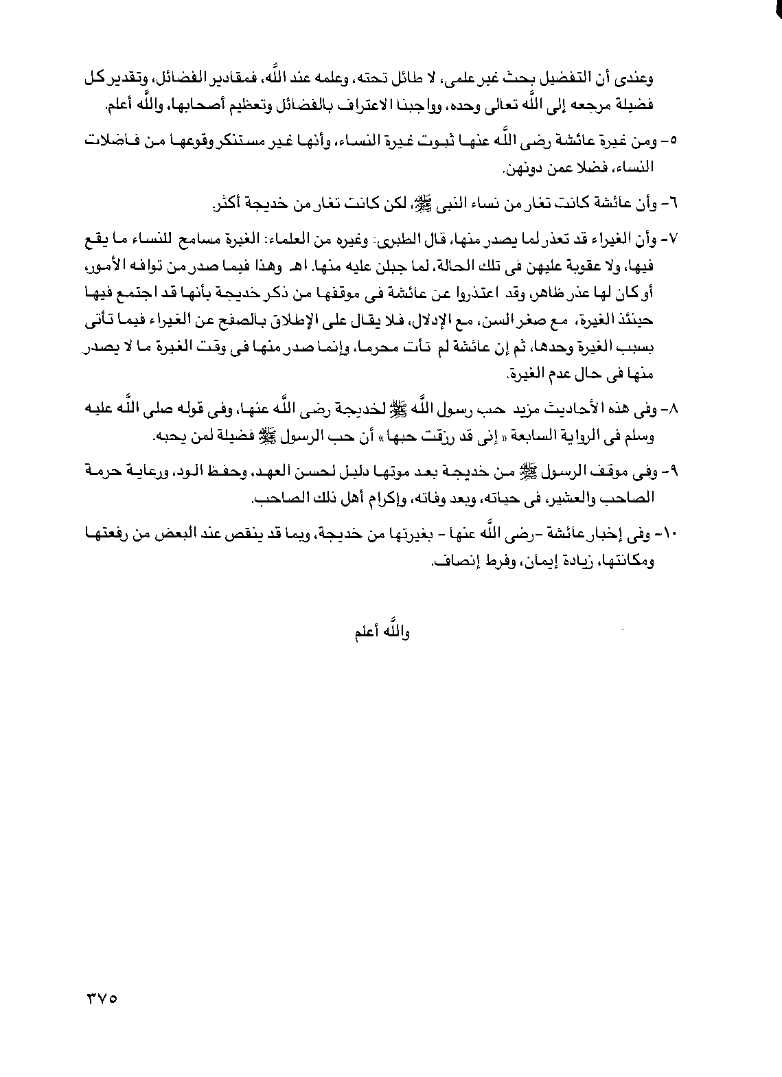 10 - وفي إخبار عائشة - رضي الله عنها - بغيرتها من خديجة، وبما قد ينقص عند البعض من رفعتها ومكانتها زيادة إيمان، وفرط إنصاف.