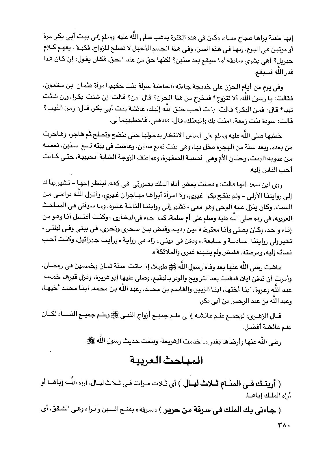 روى ابن سعد أنها قالت: "فضلت بعشر أتاه الملك بصورتي في كفه لينظر إليها - تشير بذلك إلى روايتنا الأولى - ولم ينكح بكرا غيري، ولا امرأة أبواها مهاجران غيري، وأنزل الله براءتي من السماء، وكان ينزل عليه الوحي وهو معي" تشير إلى روايتنا الثالثة عشرة وما سيأتي في المباحث العربية، في رده صلى الله عليه وسلم على أم سلمة، كما جاء في البخاري "وكنت أغتسل أنا وهو من إناء واحد وكان يصلي وأنا معترضة بين يديه، وقبض بين سحري ونحري، في بيتي وفي ليلتي" تشير إلى روايتنا السادسة والسابعة، "ودفن في بيتي" زاد في رواية "ورأيت جبرائيل، وكنت أحب نسائه إليه، ومرضته، فقبض ولم يشهده غيري والملائكة".