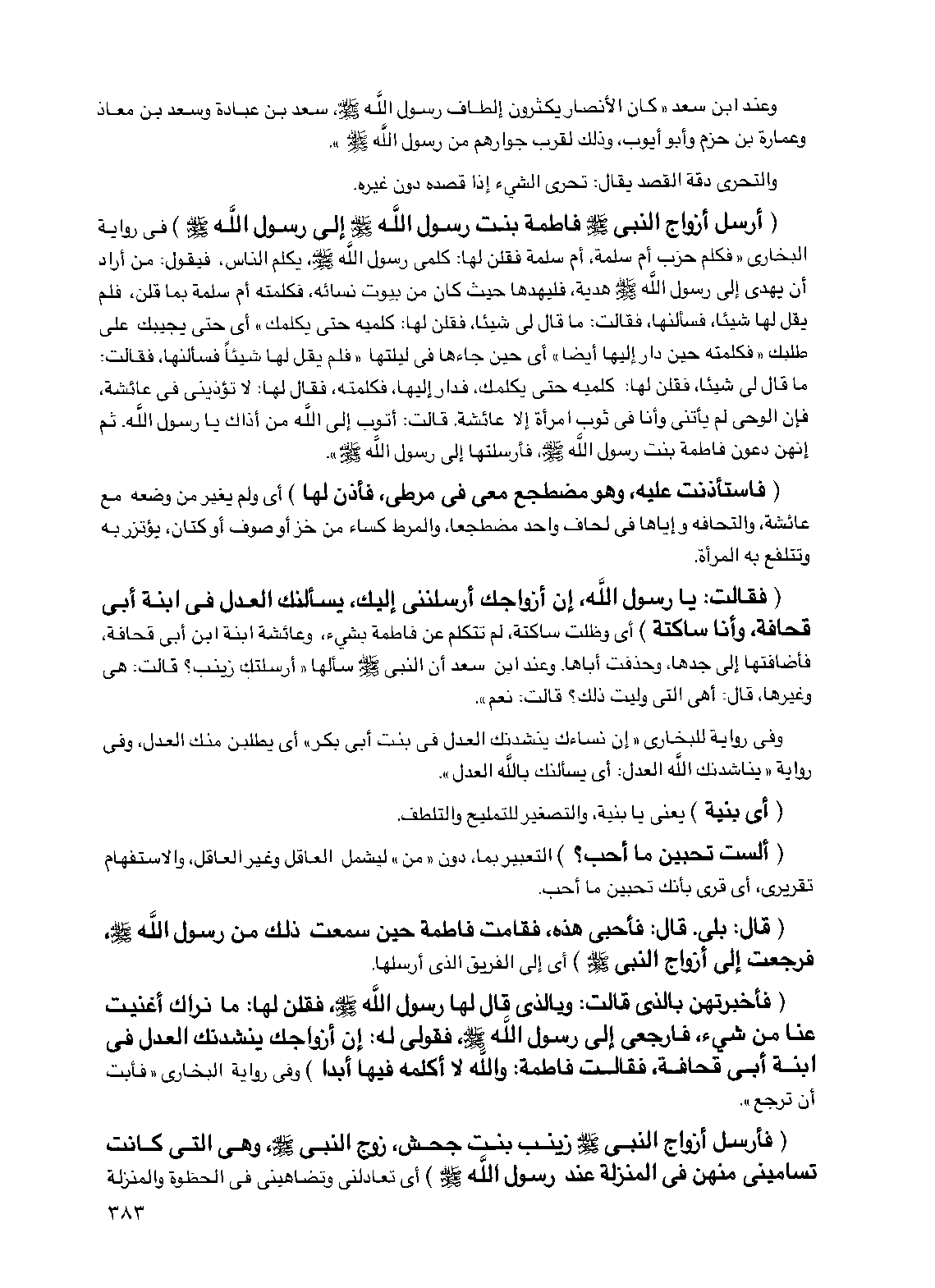 (أرسل أزواج النبي صلى الله عليه وسلم فاطمة بنت رسول الله صلى الله عليه وسلم إلى رسول الله صلى الله عليه وسلم) في رواية البخاري "فكلم حزب أم سلمة أم سلمة فقلن لها: كلمي رسول الله صلى الله عليه وسلم يكلم الناس فيقول: من أراد أن يهدي إلى رسول الله صلى الله عليه وسلم هدية فليهدها حيث كان من بيوت نسائه فكلمته أم سلمة بما قلن، فلم يقل لها شيئا، فسألنها فقالت: ما قال لي شيئا فقلن لها: كلميه حتى يكلمك، أي حتى يجيبك على طلبك "فكلمته حين دار إليها أيضا" أي حين جاءها في ليلتها "فلم يقل لها شيئا فسألنها فقالت: ما قال لي شيئا، فقلن لها: كلميه حتى يكلمك فدار إليها فكلمته، فقال لها: لا تؤذيني في عائشة فإن الوحي لم يأتني وأنا في ثوب امرأة إلا عائشة قالت: أتوب إلى الله من أذاك يا رسول الله ثم إنهن دعون فاطمة بنت رسول الله صلى الله عليه وسلم فأرسلتها إلى رسول الله صلى الله عليه وسلم".