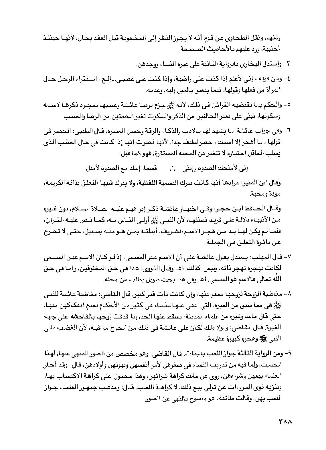 6 - وفي جواب عائشة ما يشهد لها بالأدب والذكاء والرقة وحسن العشرة قال الطيبي: الحصر في قولها "ما أهجر إلا اسمك" حصر لطيف جدا، لأنها أخبرت أنها إذا كانت في حال الغضب الذي يسلب العاقل اختياره لا تتغير عن المحبة المستقرة فهو كما قيل: