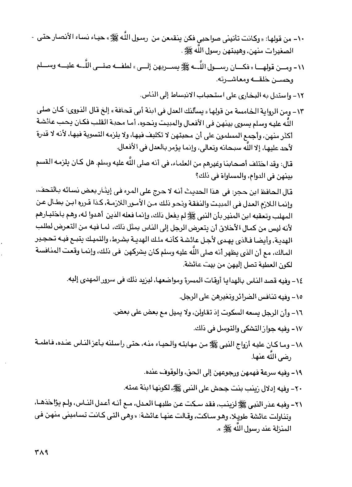 13 - ومن الرواية الخامسة من قولها "يسألنك العدل في ابنة أبي قحافة" إلخ قال النووي: كان صلى الله عليه وسلم يسوي بينهن في الأفعال والمبيت ونحوه أما محبة القلب فكان يحب عائشة أكثر منهن وأجمع المسلمون على أن محبتهن لا تكليف فيها ولا يلزمه التسوية فيها لأنه لا قدرة لأحد عليها إلا الله سبحانه وتعالى وإنما يؤمر بالعدل في الأفعال.