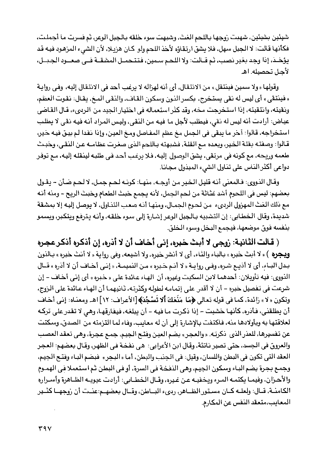 (قالت الثانية: زوجي لا أبث خبره، إني أخاف أن لا أذره إن أذكره أذكر عجره وبجره) "لا أبث خبره" بالباء والثاء أي لا أنشر خبره ولا أشيعه وفي رواية "لا أنث خبره" بالنون بدل الباء أي لا أذيع شره وفي رواية "لا أنم خبره" من النميمة "إني أخاف أن لا أذره" قال النووي: فيه تأويلان: أحدهما لابن السكيت وغيره، أن الهاء عائدة على "خبره" أي إني أخاف - إن شرعت في تفصيل خبره - أن لا أقدر على إتمامه لطوله وكثرته، ثانيهما أن الهاء عائدة على الزوج وتكون "لا" زائدة كما في قوله تعالى {ما منعك ألا تسجد} [الأعراف: 12] اهـ. ومعناه: إني أخاف أن يطلقني، فأذره كأنها خشيت - إذا ذكرت ما فيه - أن يبلغه فيفارقها وهي لا تقدر على تركه لعلاقتها به وبأولادها منه، فاكتفت بالإشارة إلى أن له معايب، وفاء لما التزمته من الصدق وسكتت عن تفسيرها للعذر الذي ذكرته "والعجر" بضم العين وفتح الجيم جمع عجرة وهي تعقد العصب والعروق في الجسد حتى تصير ناتئة وقال ابن الأعرابي: هي نفخة في الظهر وقال بعضهم: العجر العقد التي تكون في البطن واللسان وقيل: في الجنب والبطن أما "البجر" فبضم الباء وفتح الجيم وجمع بجرة بضم الباء وسكون الجيم وهي النفخة في السرة أو في البطن ثم استعملا في الهموم والأحزان وفيما يكتمه المرء ويخفيه عن غيره وقال الخطابي: أرادت عيوبه الظاهرة وأسراره الكامنة قال: ولعله كان مستور الظاهر رديء الباطن وقال بعضهم: عنت أن زوجها كثير المعايب متعقد النفس عن المكارم.