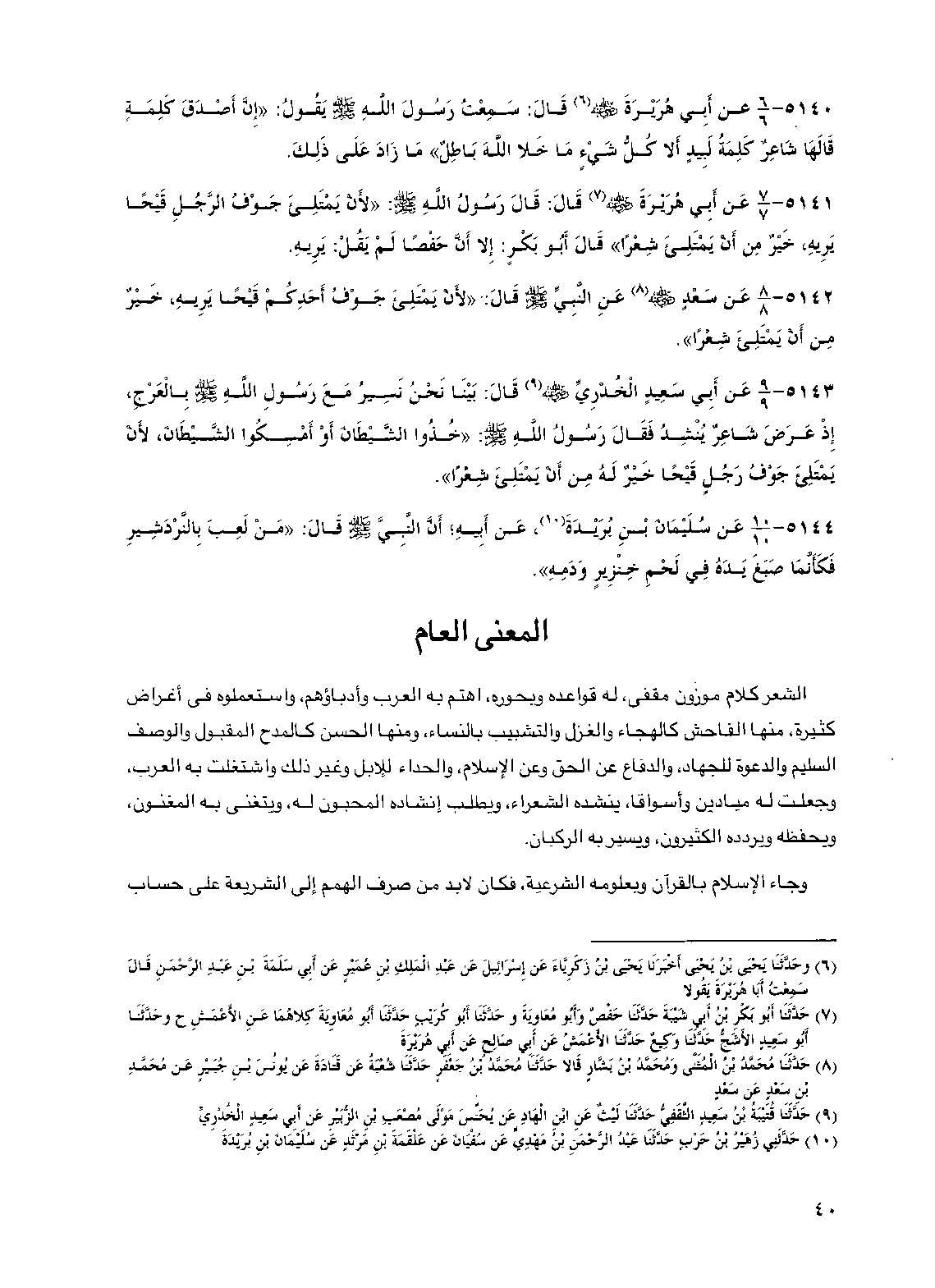 5143 - عن أبي سعيد الخدري رضي الله عنه قال: بينا نحن نسير مع رسول الله صلى الله عليه وسلم بالعرج، إذ عرض شاعر ينشد فقال رسول الله صلى الله عليه وسلم: "خذوا الشيطان أو أمسكوا الشيطان، لأن يمتلئ جوف رجل قيحا خير له من أن يمتلئ شعرا".