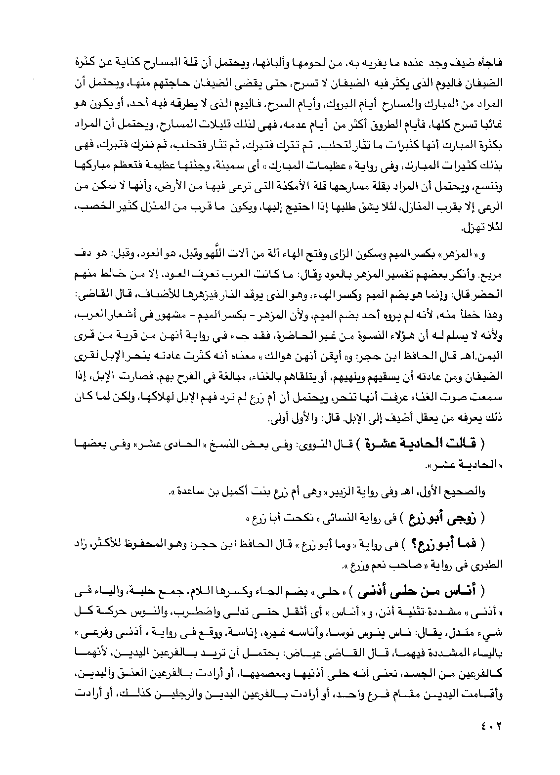 و"المزهر" بكسر الميم وسكون الزاي وفتح الهاء آلة من آلات اللهو وقيل هو العود وقيل: هو دف مربع. وأنكر بعضهم تفسير المزهر بالعود وقال: ما كانت العرب تعرف العود إلا من خالط منهم الحضر قال: وإنما هو بضم الميم وكسر الهاء وهو الذي يوقد النار فيزهرها للأضياف قال القاضي: وهذا خطأ منه لأنه لم يروه أحد بضم الميم ولأن المزهر- بكسر الميم - مشهور في أشعار العرب ولأنه لا يسلم له أن هؤلاء النسوة من غير الحاضرة فقد جاء في رواية أنهن من قرية من قرى اليمن اهـ قال الحافظ ابن حجر: و"أيقن أنهن هوالك" معناه أنه كثرت عادته بنحر الإبل لقرى الضيفان ومن عادته أن يسقيهم ويلهيهم، أو يتلقاهم بالغناء مبالغة في الفرح بهم فصارت الإبل إذا سمعت صوت الغناء عرفت أنها تنحر ويحتمل أن أم زرع لم ترد فهم الإبل لهلاكها ولكن لما كان ذلك يعرفه من يعقل أضيف إلى الإبل قال: والأول أولى.