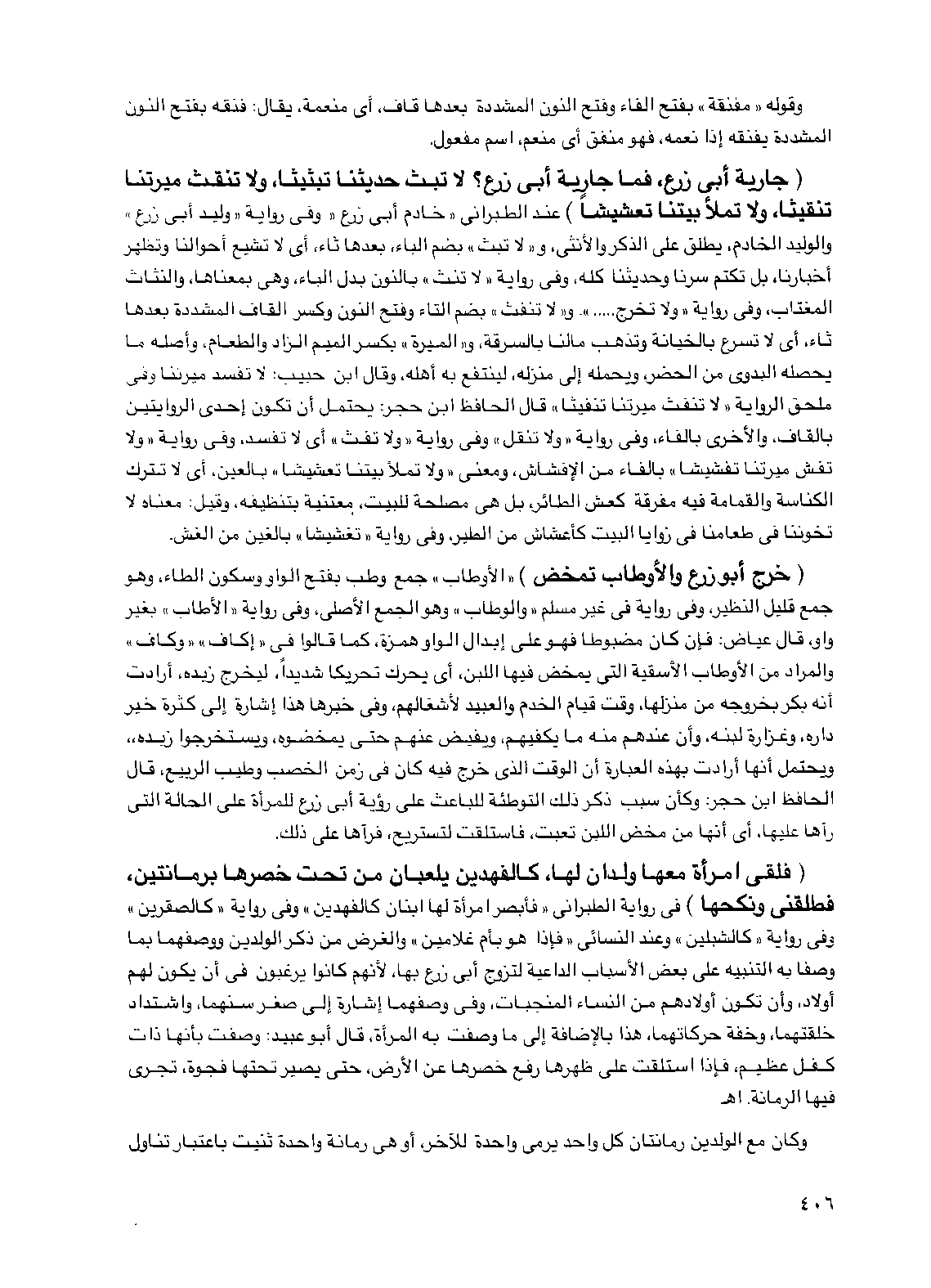 (جارية أبي زرع، فما جارية أبي زرع؟ لا تبث حديثنا تبثيثا ولا تنقث ميرتنا تنقيثا ولا تملأ بيتنا تعشيشا) عند الطبراني "خادم أبي زرع" وفي رواية "وليد أبي زرع" والوليد الخادم يطلق على الذكر والأنثى و"لا تبث" بضم الباء بعدها ثاء أي لا تشيع أحوالنا وتظهر أخبارنا بل تكتم سرنا وحديثنا كله وفي رواية "لا تنث" بالنون بدل الباء وهي بمعناها والنثاث المغتاب وفي رواية "ولا تخرج ... " و"لا تنفث" بضم التاء وفتح النون وكسر القاف المشددة بعدها ثاء أي لا تسرع بالخيانة وتذهب مالنا بالسرقة و"الميرة" بكسر الميم الزاد والطعام وأصله ما يحصله البدوي من الحضر ويحمله إلى منزله لينتفع به أهله وقال ابن حبيب: لا تفسد ميرتنا وفي ملحق الرواية "لا تنفث ميرتنا تنفيثا" قال الحافظ ابن حجر: يحتمل أن تكون إحدى الروايتين بالقاف والأخرى بالفاء وفي رواية "ولا تنقل" وفي رواية "ولا تفث" أي لا تفسد وفي رواية "ولا تفش ميرتنا تفشيشا" بالفاء من الإفشاش ومعنى "ولا تملأ بيتنا تعشيشا" بالعين أي لا تترك الكناسة والقمامة فيه مفرقة كعش الطائر بل هي مصلحة للبيت معتنية بتنظيفه وقيل: معناه لا تخوننا في طعامنا في زوايا البيت كأعشاش من الطير وفي رواية "تغشيشا" بالغين من الغش.