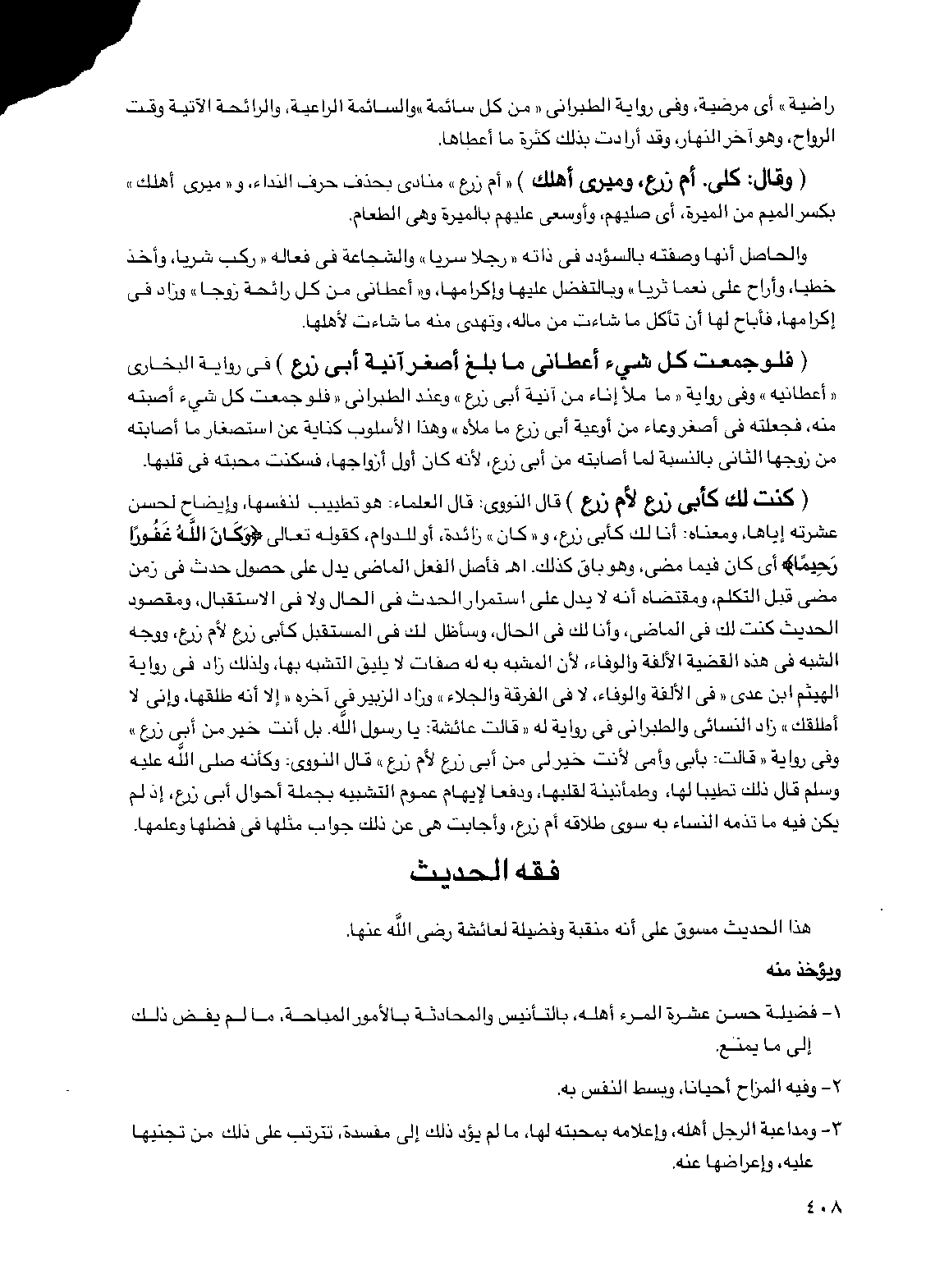 (كنت لك كأبي زرع لأم زرع) قال النووي: قال العلماء: هو تطييب لنفسها وإيضاح لحسن عشرته إياها ومعناه: أنا لك كأبي زرع و"كان" زائدة أو للدوام كقوله تعالى {وكان الله غفورا رحيما} أي كان فيما مضى وهو باق كذلك. اهـ. فأصل الفعل الماضي يدل على حصول حدث في زمن مضى قبل التكلم ومقتضاه أنه لا يدل على استمرار الحدث في الحال ولا في الاستقبال ومقصود الحديث كنت لك في الماضي وأنا لك في الحال، وسأظل لك في المستقبل كأبي زرع لأم زرع ووجه الشبه في هذه القضية الألفة والوفاء لأن المشبه به له صفات لا يليق التشبه بها ولذلك زاد في رواية الهيثم ابن عدي "في الألفة والوفاء لا في الفرقة والجلاء" وزاد الزبير في آخره "إلا أنه طلقها وإني لا أطلقك" زاد النسائي والطبراني في رواية له "قالت عائشة: يا رسول الله. بل أنت خير من أبي زرع" وفي رواية "قالت: بأبي وأمي لأنت خير لي من أبي زرع لأم زرع" قال النووي: وكأنه صلى الله عليه وسلم قال ذلك تطيبا لها وطمأنينة لقلبها ودفعا لإيهام عموم التشبيه بجملة أحوال أبي زرع إذ لم يكن فيه ما تذمه النساء به سوى طلاقه أم زرع وأجابت هي عن ذلك جواب مثلها في فضلها وعلمها.