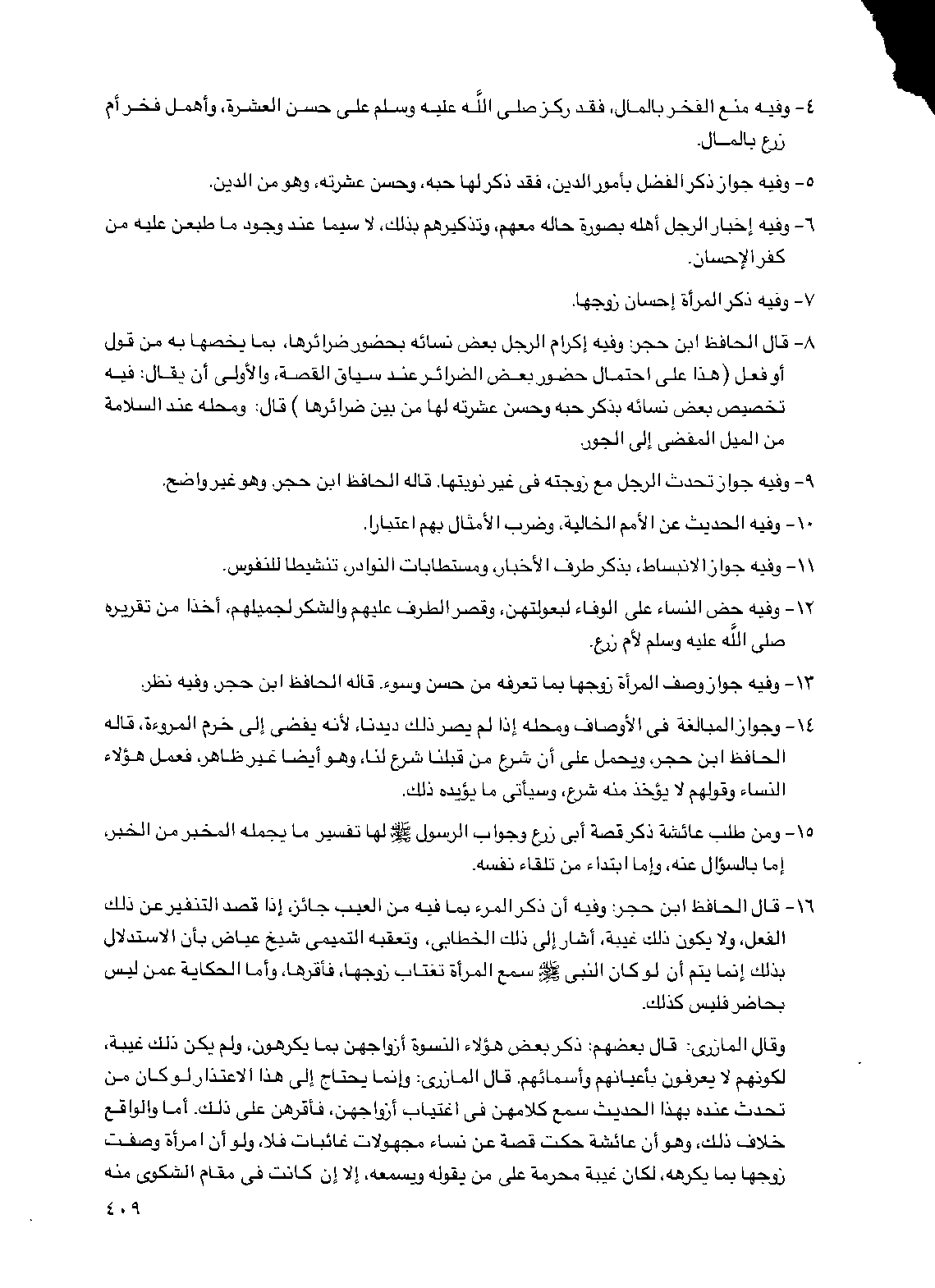 16 - قال الحافظ ابن حجر: وفيه أن ذكر المرء بما فيه من العيب جائز إذا قصد التنفير عن ذلك الفعل ولا يكون ذلك غيبة أشار إلى ذلك الخطابي وتعقبه التميمي شيخ عياض بأن الاستدلال بذلك إنما يتم أن لو كان النبي صلى الله عليه وسلم سمع المرأة تغتاب زوجها فأقرها وأما الحكاية عمن ليس بحاضر فليس كذلك.