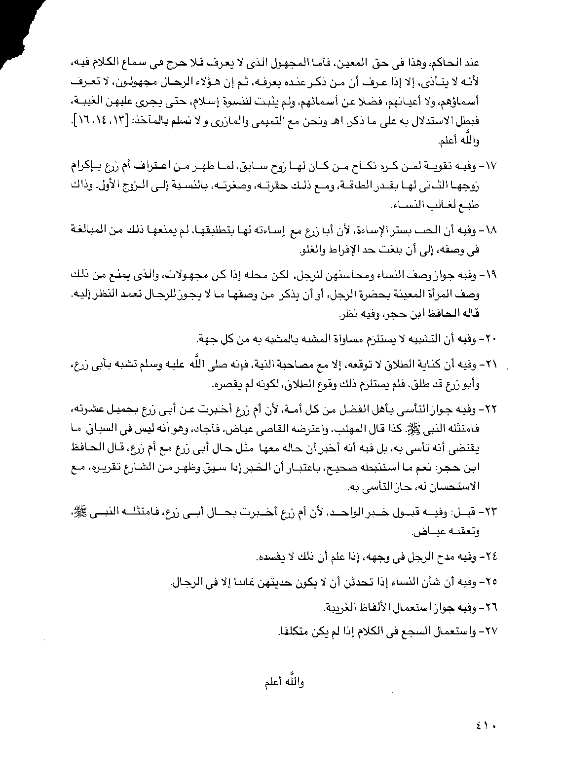 19 - وفيه جواز وصف النساء ومحاسنهن للرجل لكن محله إذا كن مجهولات والذي يمنع من ذلك وصف المرأة المعينة بحضرة الرجل أو أن يذكر من وصفها ما لا يجوز للرجال تعمد النظر إليه. قاله الحافظ ابن حجر وفيه نظر.