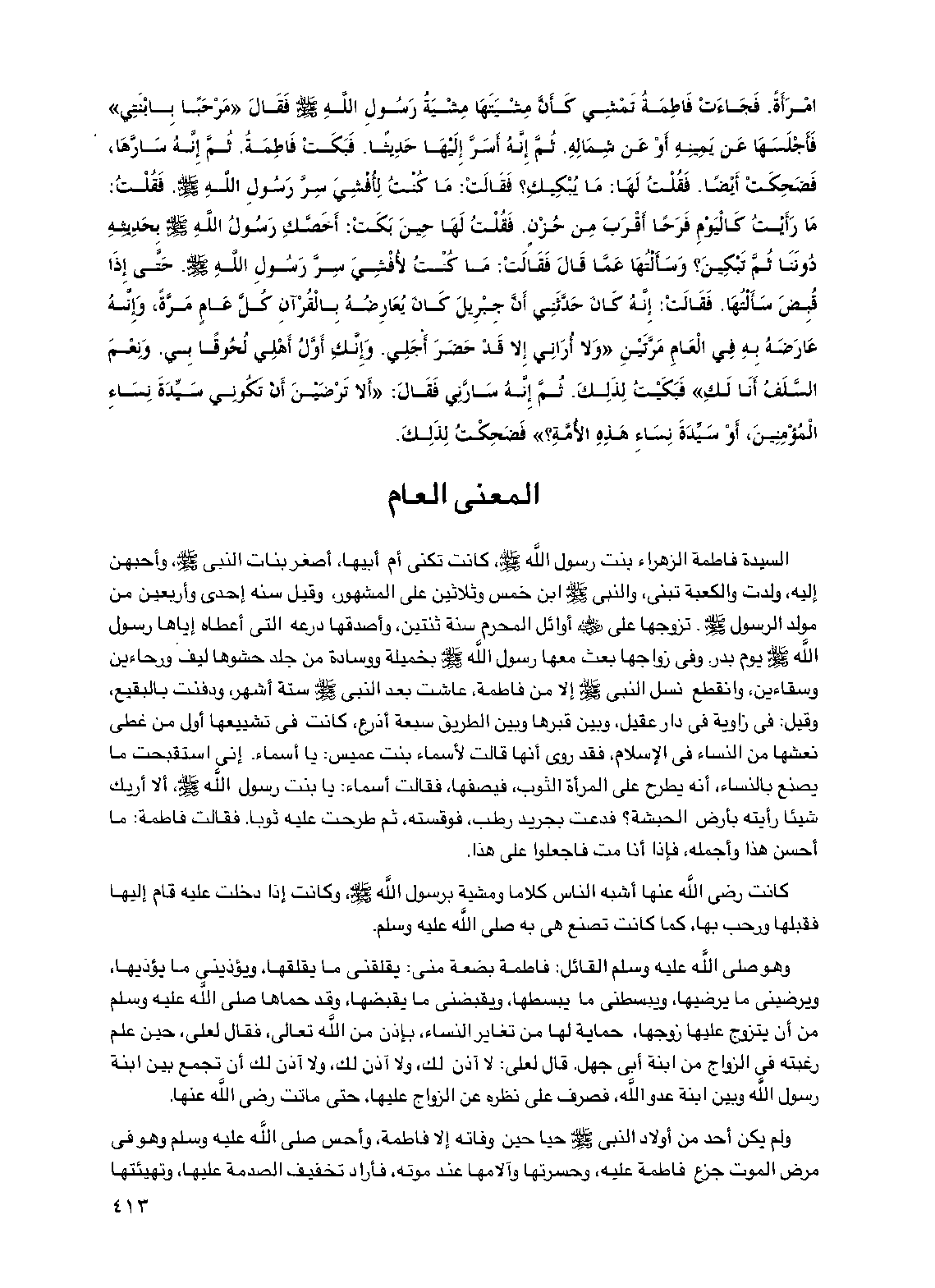 امرأة فجاءت فاطمة تمشي كأن مشيتها مشية رسول الله صلى الله عليه وسلم فقال "مرحبا بابنتي" فأجلسها عن يمينه أو عن شماله. ثم إنه أسر إليها حديثا. فبكت فاطمة. ثم إنه سارها، فضحكت أيضا فقلت لها: ما يبكيك؟ فقالت: ما كنت لأفشي سر رسول الله صلى الله عليه وسلم فقلت: ما رأيت كاليوم فرحا أقرب من حزن. فقلت لها حين بكت: أخصك رسول الله صلى الله عليه وسلم بحديثه دوننا ثم تبكين؟ وسألتها عما قال فقالت: ما كنت لأفشي سر رسول الله صلى الله عليه وسلم حتى إذا قبض سألتها. فقالت: إنه كان حدثني أن جبريل كان يعارضه بالقرآن كل عام مرة وإنه عارضه به في العام مرتين "ولا أراني إلا قد حضر أجلي. وإنك أول أهلي لحوقا بي. ونعم السلف أنا لك" فبكيت لذلك. ثم إنه سارني فقال: "ألا ترضين أن تكوني سيدة نساء المؤمنين أو سيدة نساء هذه الأمة؟ " فضحكت لذلك.