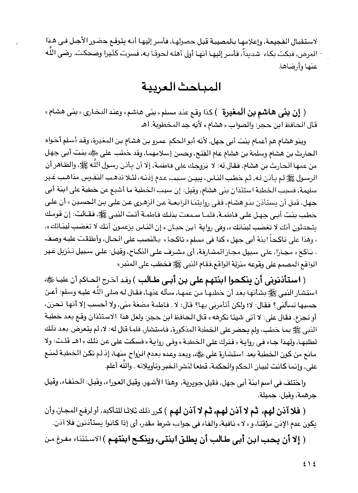 (استأذنوني أن ينكحوا ابنتهم علي بن أبي طالب) وقد أخرج الحاكم أن عليا رضي الله عنه استشار النبي صلى الله عليه وسلم بشأنها بعد أن خطبها من عمها سأله عنها فقال له صلى الله عليه وسلم: أعن حسبها تسألني؟ فقال: لا ولكن أتأمرني بها؟ قال: لا. فاطمة مضغة مني ولا أحسب إلا أنها تحزن أو تجزع فقال علي: لا آتي شيئا تكرهه" قال الحافظ ابن حجر: ولعل هذا الاستئذان وقع بعد خطبة النبي صلى الله عليه وسلم بما خطب ولم يحضر على الخطبة المذكورة فاستشار فلما قال له: لا لم يتعرض بعد ذلك لطلبها ولهذا جاء في رواية "فترك علي الخطبة" وفي رواية "فسكت علي عن ذلك" اهـ. قلت: ولا مانع من كون الخطبة بعد استشارة علي رضي الله عنه وبعد وعده بعدم الزواج منها إذ لم تكن الخطبة لمنع علي وإنما كانت لبيان الحكم والحكمة قطعا لنشر الخبر وتأويلاته. والله أعلم.