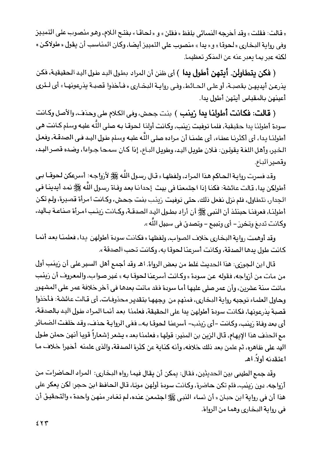 قال ابن الجوزي: هذا الحديث غلط من بعض الرواة اهـ. وقد أجمع أهل السير على أن زينب أول من مات من أزواجه فقوله عن سودة "وكانت أسرعنا لحوقا به" غير صواب والمعروف أن زينب ماتت سنة عشرين وأن عمر صلى عليها أما سودة فقد ماتت بعدها في آخر خلافة عمر على المشهور وحاول العلماء توجيه رواية البخاري فمنهم من وجهها بتقدير محذوفات أي قالت عائشة: فأخذوا قصبة يذرعونها، فكانت سودة أطولهن يدا على الحقيقة فعلمنا بعد أنما المراد طول اليد بالصدقة أي بعد وفاة زينب، وكانت - أي زينب - أسرعنا لحوقا به، ففي الرواية حذف وقد خلفت الضمائر مع الحذف هذا الإيهام قال الزين بن المنير: قولها "فعلمنا بعد" يشعر إشعارا قويا أنهن حملن طول اليد على ظاهره، ثم علمن بعد ذلك خلافه وأنه كناية عن كثرة الصدقة والذي علمنه أخيرا خلاف ما اعتقدنه أولا. اهـ.