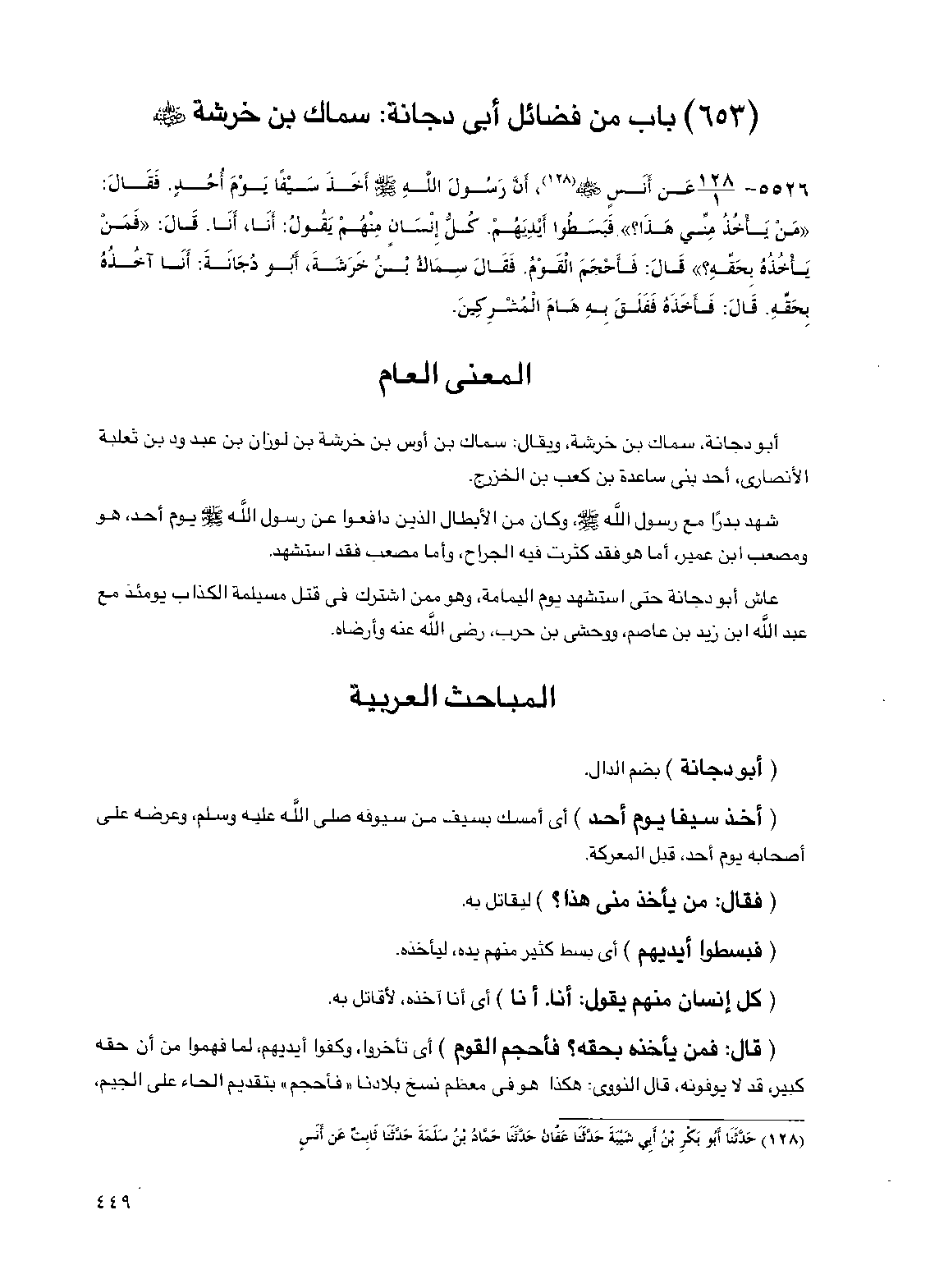 5526 - عن أنس رضي الله عنه أن رسول الله صلى الله عليه وسلم أخذ سيفا يوم أحد فقال: "من يأخذ مني هذا؟ " فبسطوا أيديهم كل إنسان منهم يقول: أنا أنا قال: "فمن يأخذه بحقه؟ " قال: فأحجم القوم فقال سماك بن خرشة أبو دجانة: أنا آخذه بحقه. قال: فأخذه ففلق به هام المشركين.