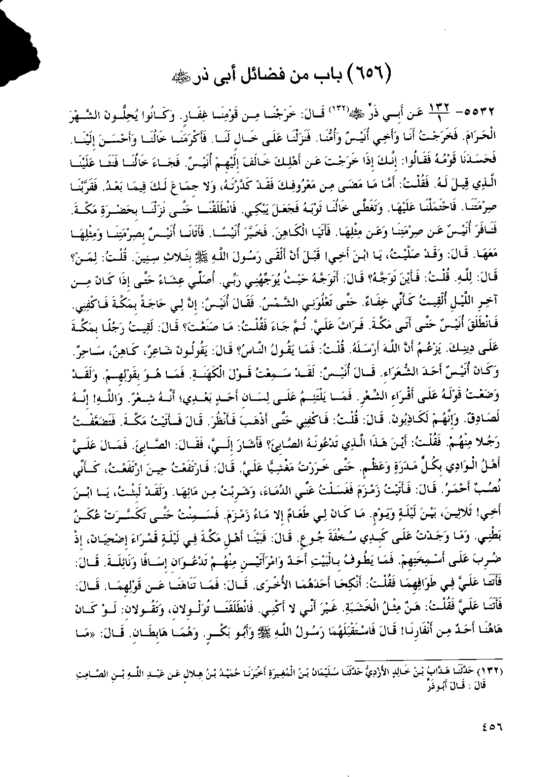 5532 - عن أبي ذر رضي الله عنه قال: خرجنا من قومنا غفار وكانوا يحلون الشهر الحرام فخرجت أنا وأخي أنيس وأمنا. فنزلنا على خال لنا. فأكرمنا خالنا وأحسن إلينا. فحسدنا قومه فقالوا: إنك إذا خرجت عن أهلك خالف إليهم أنيس. فجاء خالنا فنثا علينا الذي قيل له. فقلت: أما ما مضى من معروفك فقد كدرته، ولا جماع لك فيما بعد فقربنا صرمتنا فاحتملنا عليها. وتغطى خالنا ثوبه فجعل يبكي. فانطلقنا حتى نزلنا بحضرة مكة فنافر أنيس عن صرمتنا وعن مثلها فأتيا الكاهن. فخير أنيسا فأتانا أنيس بصرمتنا ومثلها معها قال: وقد صليت، يا ابن أخي! قبل أن ألقى رسول الله صلى الله عليه وسلم بثلاث سنين. قلت: لمن؟ قال: لله. قلت: فأين توجه؟ قال: أتوجه حيث يوجهني ربي. أصلي عشاء حتى إذا كان من آخر الليل ألقيت كأني خفاء. حتى تعلوني الشمس فقال أنيس: إن لي حاجة بمكة فاكفني. فانطلق أنيس حتى أتى مكة فراث علي ثم جاء فقلت: ما صنعت؟ قال: لقيت رجلا بمكة على دينك. يزعم أن الله أرسله قلت: فما يقول الناس؟ قال: يقولون شاعر، كاهن، ساحر. وكان أنيس أحد الشعراء. قال أنيس: لقد سمعت قول الكهنة فما هو بقولهم ولقد وضعت قوله على أقراء الشعر فما يلتئم على لسان أحد بعدي، أنه شعر. والله! إنه لصادق وإنهم لكاذبون قال: قلت: فاكفني حتى أذهب فأنظر قال فأتيت مكة. فتضعفت رجلا منهم فقلت: أين هذا الذي تدعونه الصابئ؟ فأشار إلي فقال: الصابئ فمال علي أهل الوادي بكل مدرة وعظم. حتى خررت مغشيا علي. قال: فارتفعت حين ارتفعت كأني نصب أحمر. قال: فأتيت زمزم فغسلت عني الدماء وشربت من مائها. ولقد لبثت يا ابن أخي! ثلاثين بين ليلة ويوم ما كان لي طعام إلا ماء زمزم فسمنت حتى تكسرت عكن بطني وما وجدت على كبدي سخفة جوع. قال: فبينا أهل مكة في ليلة قمراء إضحيان، إذ ضرب على أسمختهم. فما يطوف بالبيت أحد وامرأتين منهم تدعوان إسافا ونائلة.