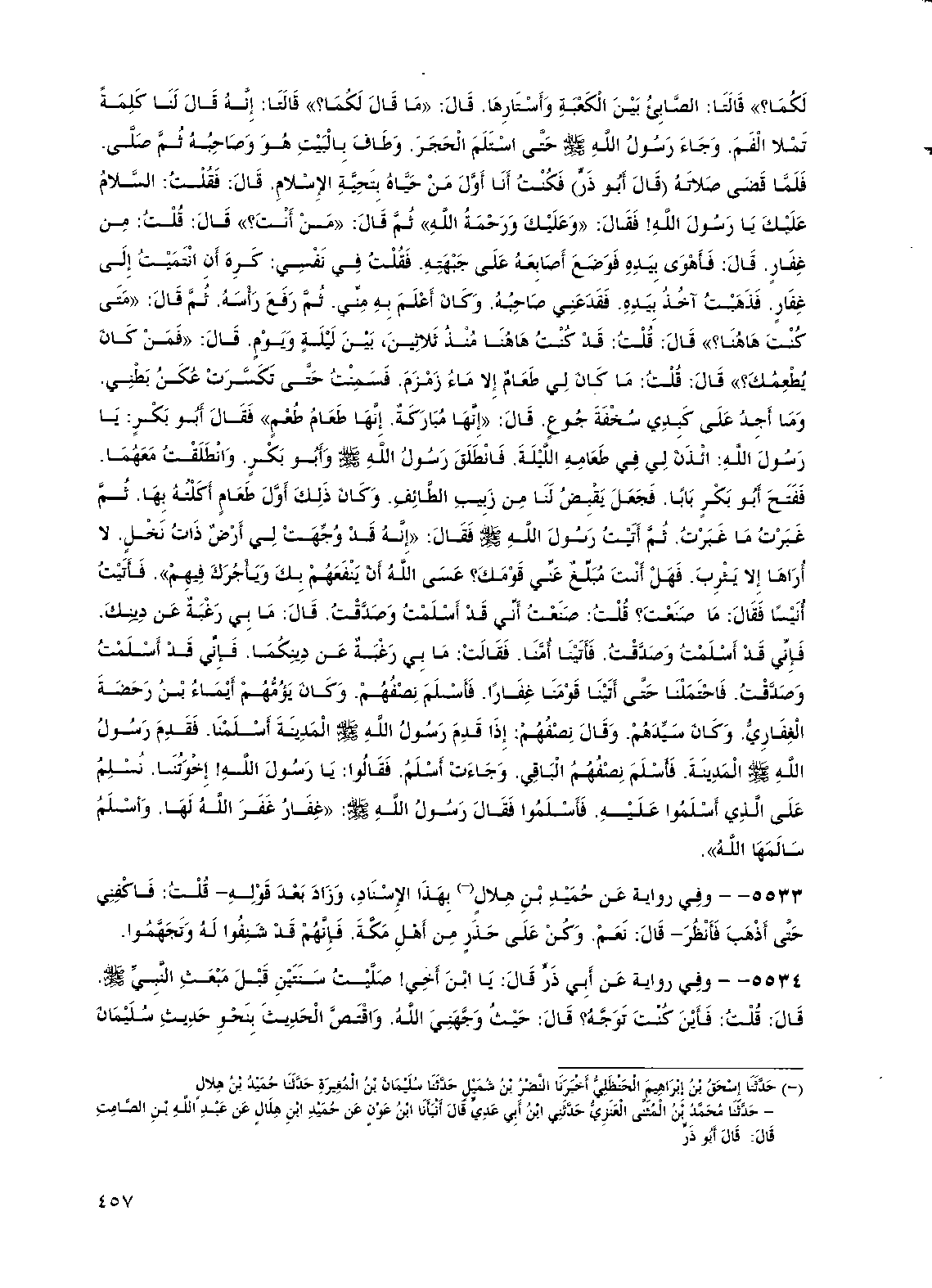 لكما؟ " قالتا: الصابئ بين الكعبة وأستارها. قال: "ما قال لكما؟ " قالتا: إنه قال لنا كلمة تملا الفم. وجاء رسول الله صلى الله عليه وسلم حتى استلم الحجر. وطاف بالبيت هو وصاحبه ثم صلى. فلما قضى صلاته (قال أبو ذر) فكنت أنا أول من حياه بتحية الإسلام قال: فقلت: السلام عليك يا رسول الله! فقال: "وعليك ورحمة الله" ثم قال: "من أنت؟ " قال: قلت: من غفار. قال: فأهوى بيده فوضع أصابعه على جبهته. فقلت في نفسي: كره أن انتميت إلى غفار فذهبت آخذ بيده فقدعني صاحبه. وكان أعلم به مني ثم رفع رأسه ثم قال: "متى كنت ها هنا؟ " قال: قلت: قد كنت ها هنا منذ ثلاثين بين ليلة ويوم قال: "فمن كان يطعمك؟ " قال: قلت: ما كان لي طعام إلا ماء زمزم فسمنت حتى تكسرت عكن بطني وما أجد على كبدي سخفة جوع قال: "إنها مباركة إنها طعام طعم" فقال أبو بكر: يا رسول الله: ائذن لي في طعامه الليلة. فانطلق رسول الله صلى الله عليه وسلم وأبو بكر. وانطلقت معهما ففتح أبو بكر بابا. فجعل يقبض لنا من زبيب الطائف. وكان ذلك أول طعام أكلته بها. ثم غبرت ما غبرت. ثم أتيت رسول الله صلى الله عليه وسلم فقال: "إنه قد وجهت لي أرض ذات نخل. لا أراها إلا يثرب. فهل أنت مبلغ عني قومك؟ عسى الله أن ينفعهم بك ويأجرك فيهم" فأتيت أنيسا فقال: ما صنعت؟ قلت: صنعت أني قد أسلمت وصدقت. قال: ما بي رغبة عن دينك. فإني قد أسلمت وصدقت. فأتينا أمنا. فقالت: ما بي رغبة عن دينكما. فإني قد أسلمت وصدقت فاحتملنا حتى أتينا قومنا غفارا. فأسلم نصفهم. وكان يؤمهم أيماء بن رحضة الغفاري. وكان سيدهم.