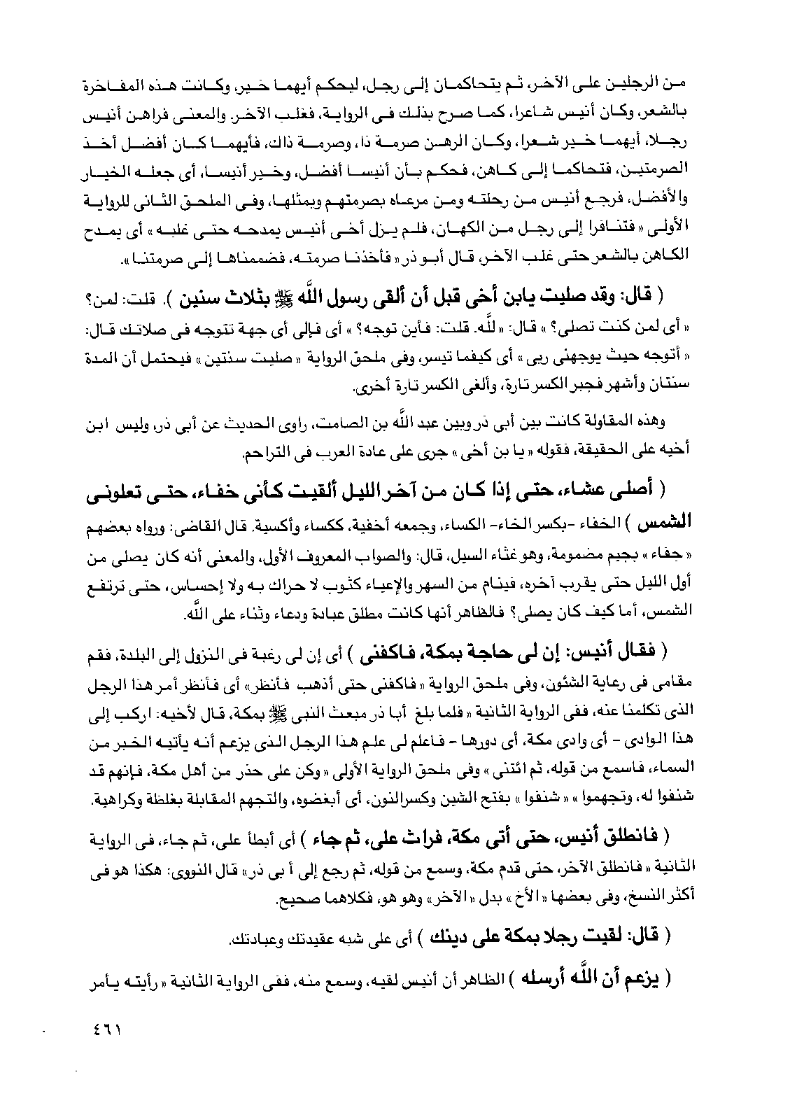 (فقال أنيس: إن لي حاجة بمكة، فاكفني) أي إن لي رغبة في النزول إلى البلدة، فقم مقامي في رعاية الشئون وفي ملحق الرواية "فاكفني حتى أذهب فأنظر" أي فأنظر أمر هذا الرجل الذي تكلمنا عنه، ففي الرواية الثانية "فلما بلغ أبا ذر مبعث النبي صلى الله عليه وسلم بمكة قال لأخيه: اركب إلى هذا الوادي - أي وادي مكة، أي دورها - فاعلم لي علم هذا الرجل الذي يزعم أنه يأتيه الخبر من السماء، فاسمع من قوله، ثم ائتني" وفي ملحق الرواية الأولى "وكن على حذر من أهل مكة، فإنهم قد شنفوا له، وتجهموا" "شنفوا" بفتح الشين وكسر النون أي أبغضوه والتجهم المقابلة بغلظة وكراهية.