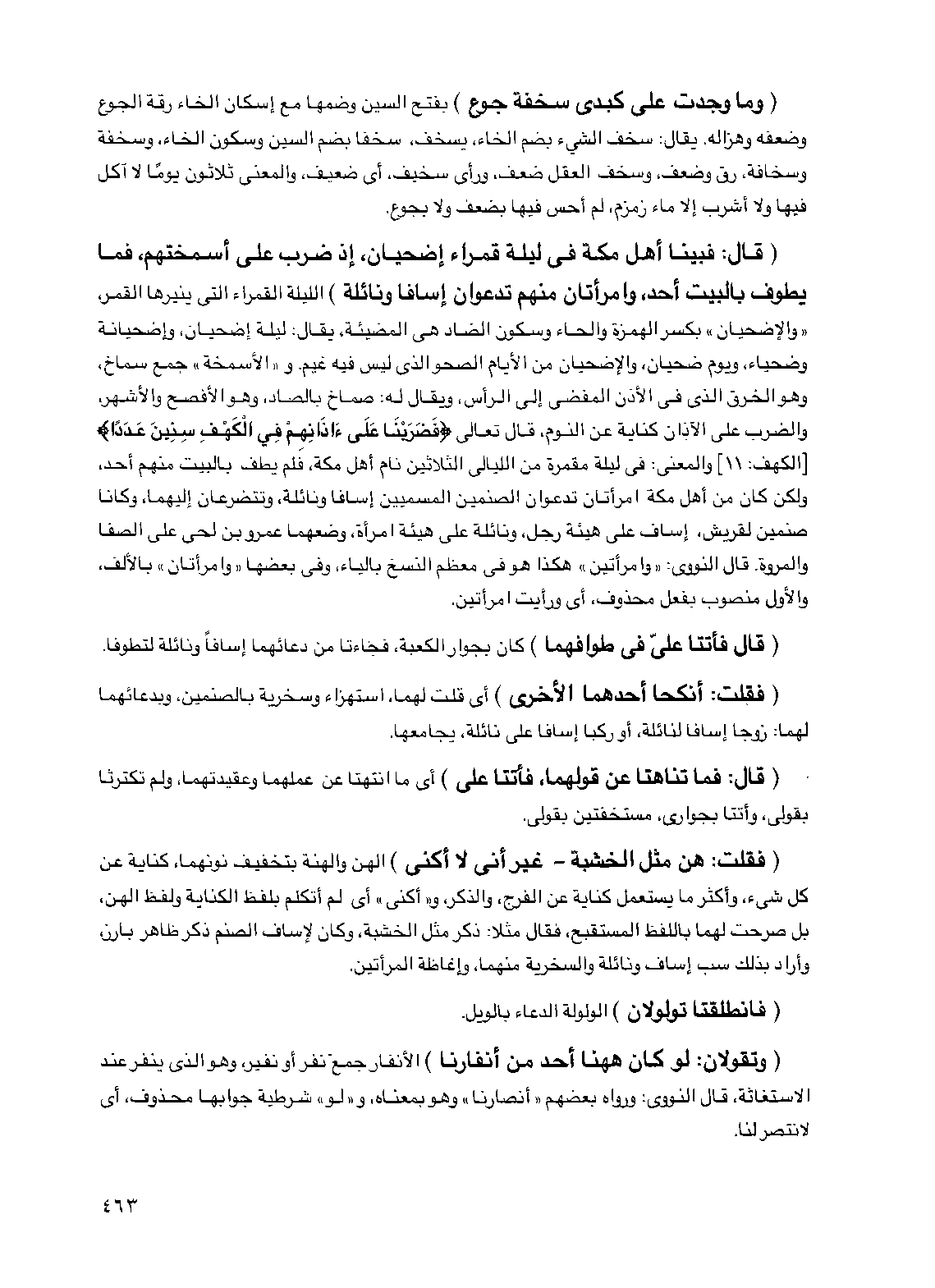 (قال: فبينا أهل مكة في ليلة قمراء إضحيان إذ ضرب على أسمختهم فما يطوف بالبيت أحد، وامرأتان منهم تدعوان إسافا ونائلة) الليلة القمراء التي ينيرها القمر، "والإضحيان" بكسر الهمزة والحاء وسكون الضاد هي المضيئة يقال: ليلة إضحيان وإضحيانة وضحياء ويوم ضحيان والإضحيان من الأيام الصحو الذي ليس فيه غيم، و"الأسمخة" جمع سماخ وهو الخرق الذي في الأذن المفضي إلى الرأس ويقال له: صماخ بالصاد، وهو الأفصح والأشهر، والضرب على الآذان كناية عن النوم، قال تعالى {فضربنا على آذانهم في الكهف سنين عددا} [الكهف: 11] والمعنى: في ليلة مقمرة من الليالي الثلاثين نام أهل مكة، فلم يطف بالبيت منهم أحد، ولكن كان من أهل مكة امرأتان تدعوان الصنمين المسميين إسافا ونائلة، وتتضرعان إليهما، وكانا صنمين لقريش، إساف على هيئة رجل، ونائلة على هيئة امرأة وضعهما عمرو بن لحي على الصفا والمروة، قال النووي: "وامرأتين" هكذا هو في معظم النسخ بالياء وفي بعضها "وامرأتان" بالألف والأول منصوب بفعل محذوف أي ورأيت امرأتين.