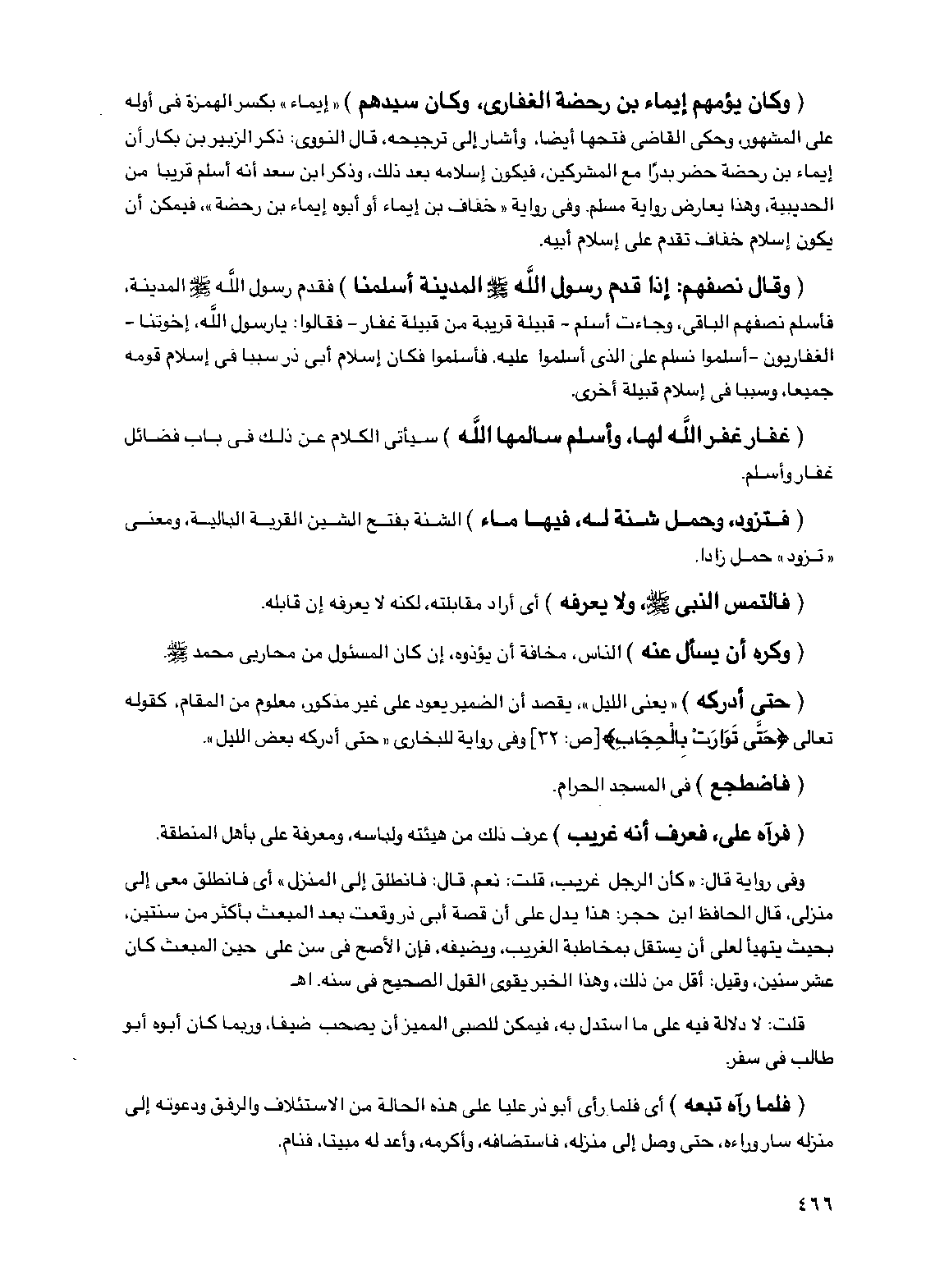 (وقال نصفهم: إذا قدم رسول الله صلى الله عليه وسلم المدينة أسلمنا) فقدم رسول الله صلى الله عليه وسلم المدينة فأسلم نصفهم الباقي وجاءت أسلم - قبيلة قريبة من قبيلة غفار - فقالوا: يا رسول الله إخوتنا - الغفاريون - أسلموا نسلم على الذي أسلموا عليه، فأسلموا فكان إسلام أبي ذر سببا في إسلام قومه جميعا، وسببا في إسلام قبيلة أخرى.