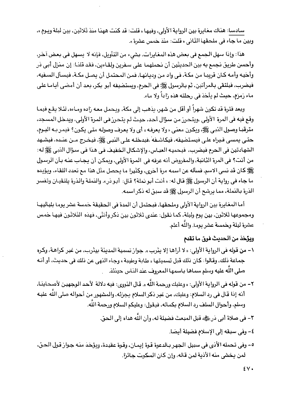 هذا: وإذا سهل الجمع في بعض هذه المغايرات، بشيء من التأويل فإنه لا يسهل في بعض آخر، وأحسن طريق نجمع به بين الحديثين أن نحملهما على سفرين ولقاءين فقد قلنا: إن منزل أبي ذر وأخيه وأمه كان قريبا من مكة في واد من وديانها، فمن المحتمل أن يصل مكة فيسأل السفيه فيضرب فيلتقي بالمرأتين ثم بالرسول صلى الله عليه وسلم في الحرم، ويستضيفه أبو بكر، بعد أن أمضى أياما على ماء زمزم حيث لم يأخذ في رحلته هذه زادا ولا ماء.