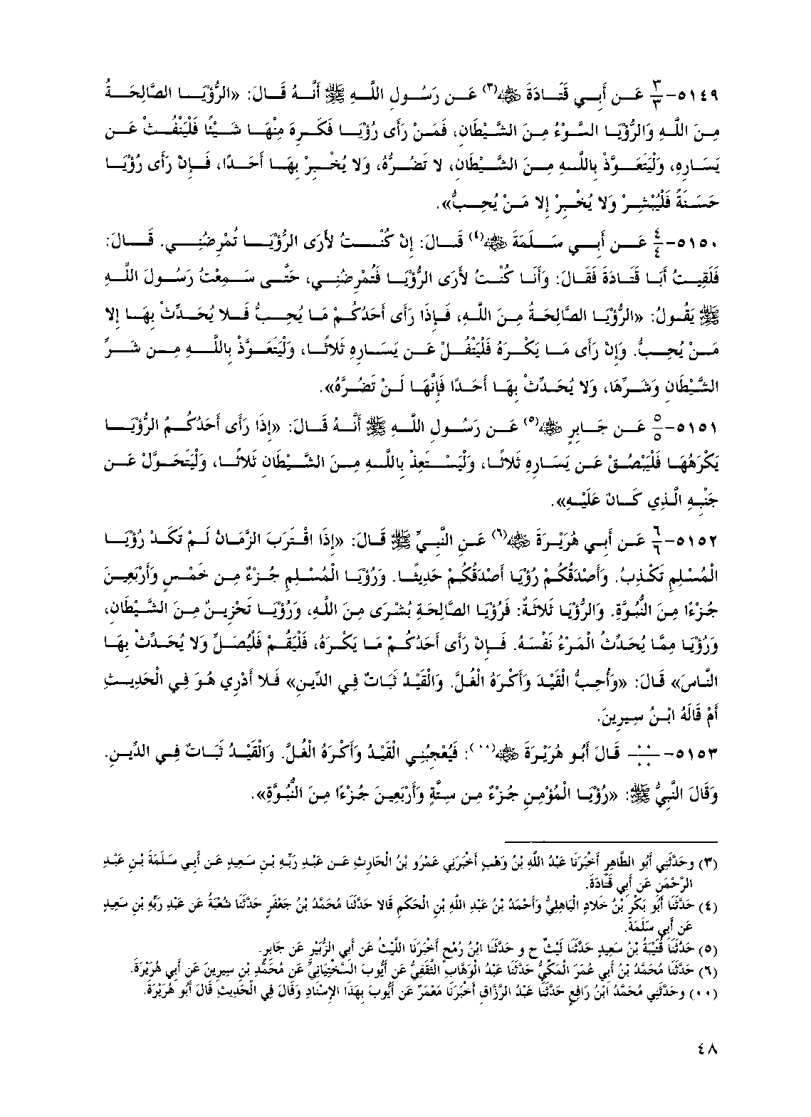 5153 - قال أبو هريرة رضي الله عنه فيعجبني القيد وأكره الغل. والقيد ثبات في الدين. وقال النبي صلى الله عليه وسلم: "رؤيا المؤمن جزء من ستة وأربعين جزءا من النبوة".