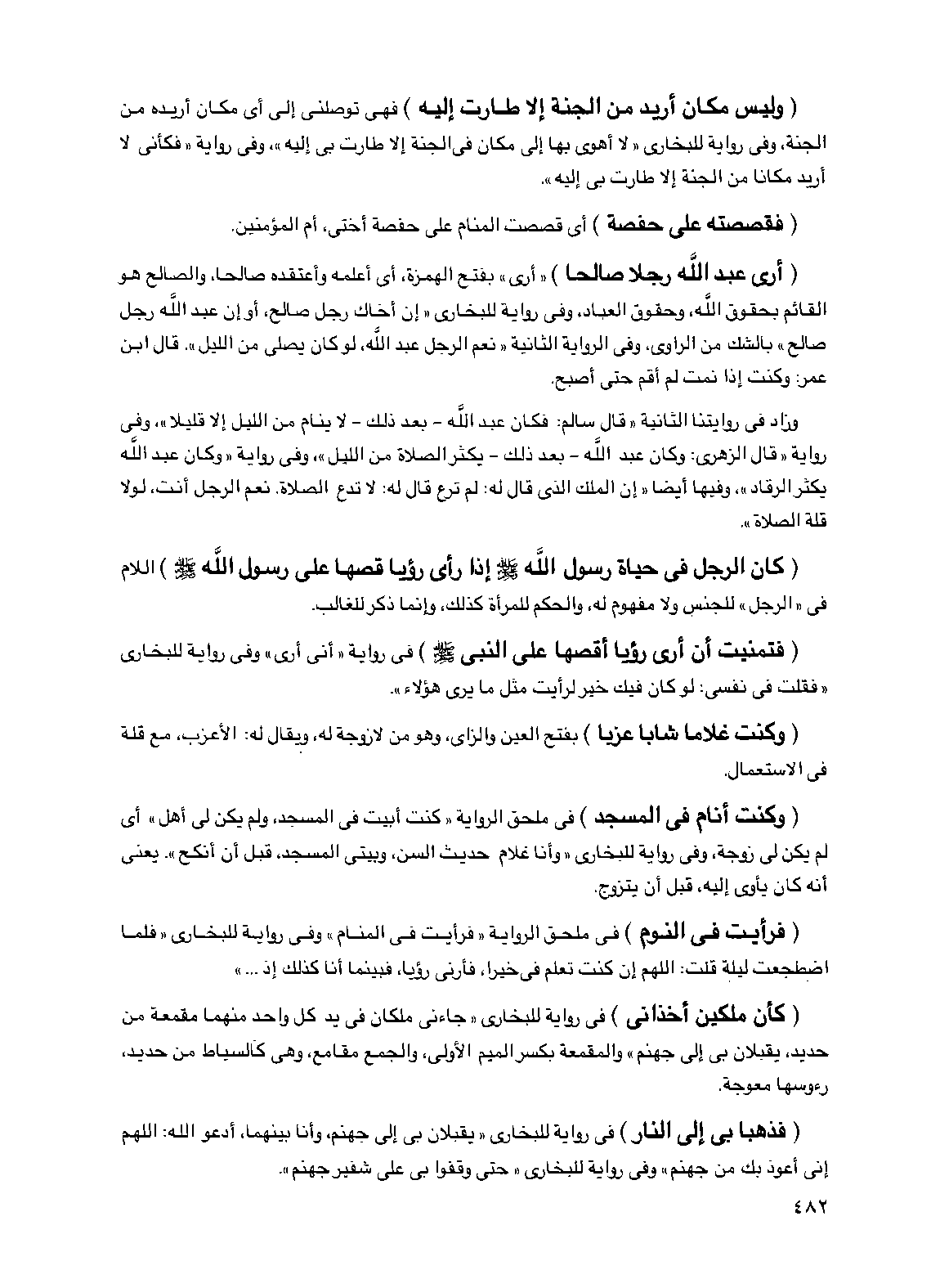 (أرى عبد الله رجلا صالحا) "أرى" بفتح الهمزة أي أعلمه وأعتقده صالحا والصالح هو القائم بحقوق الله وحقوق العباد وفي رواية للبخاري "إن أخاك رجل صالح أو إن عبد الله رجل صالح" بالشك من الراوي وفي الرواية الثانية "نعم الرجل عبد الله لو كان يصلي من الليل" قال ابن عمر: وكنت إذا نمت لم أقم حتى أصبح.