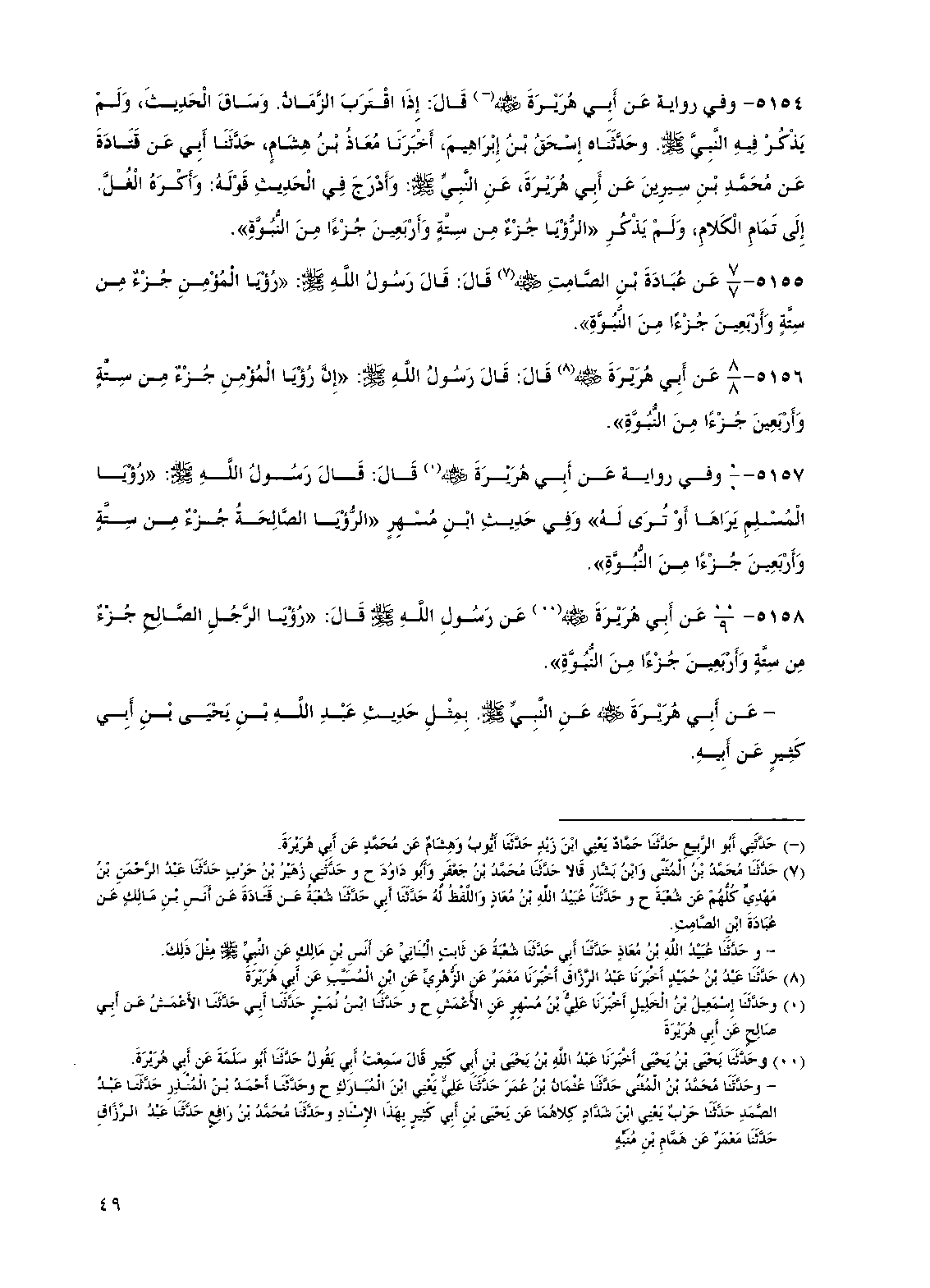 5158 - عن أبي هريرة رضي الله عنه عن رسول الله صلى الله عليه وسلم قال: "رؤيا الرجل الصالح جزء من ستة وأربعين جزءا من النبوة".