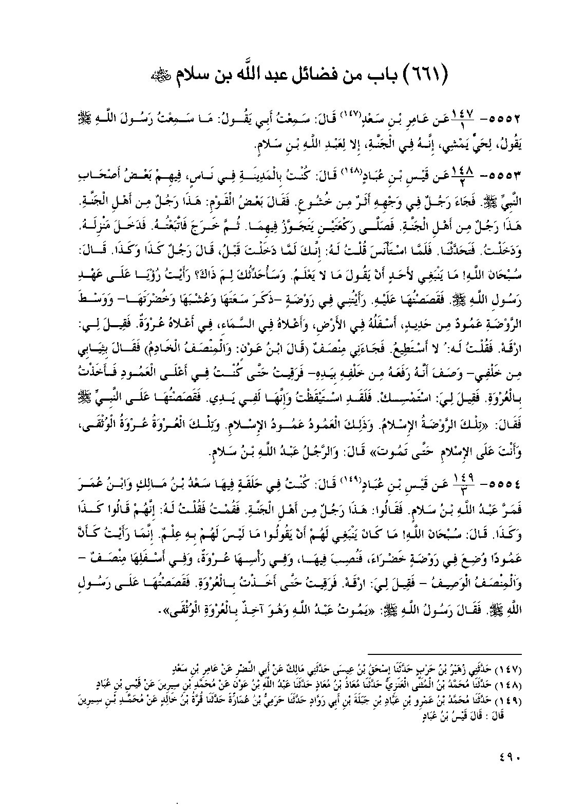 5554 - عن قيس بن عباد قال: كنت في حلقة فيها سعد بن مالك وابن عمر فمر عبد الله بن سلام فقالوا: هذا رجل من أهل الجنة فقمت فقلت له: إنهم قالوا كذا وكذا قال: سبحان الله! ما كان ينبغي لهم أن يقولوا ما ليس لهم به علم إنما رأيت كأن عمودا وضع في روضة خضراء فنصب فيها وفي رأسها عروة وفي أسفلها منصف - والمنصف الوصيف - فقيل لي: ارقه فرقيت حتى أخذت بالعروة فقصصتها على رسول الله صلى الله عليه وسلم فقال رسول الله صلى الله عليه وسلم: "يموت عبد الله وهو آخذ بالعروة الوثقى".