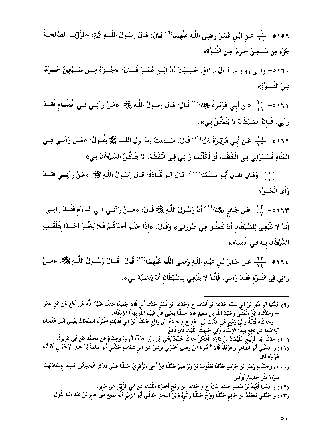 5159 - عن ابن عمر رضي الله عنهما قال: قال رسول الله صلى الله عليه وسلم: "الرؤيا الصالحة جزء من سبعين جزءا من النبوة".