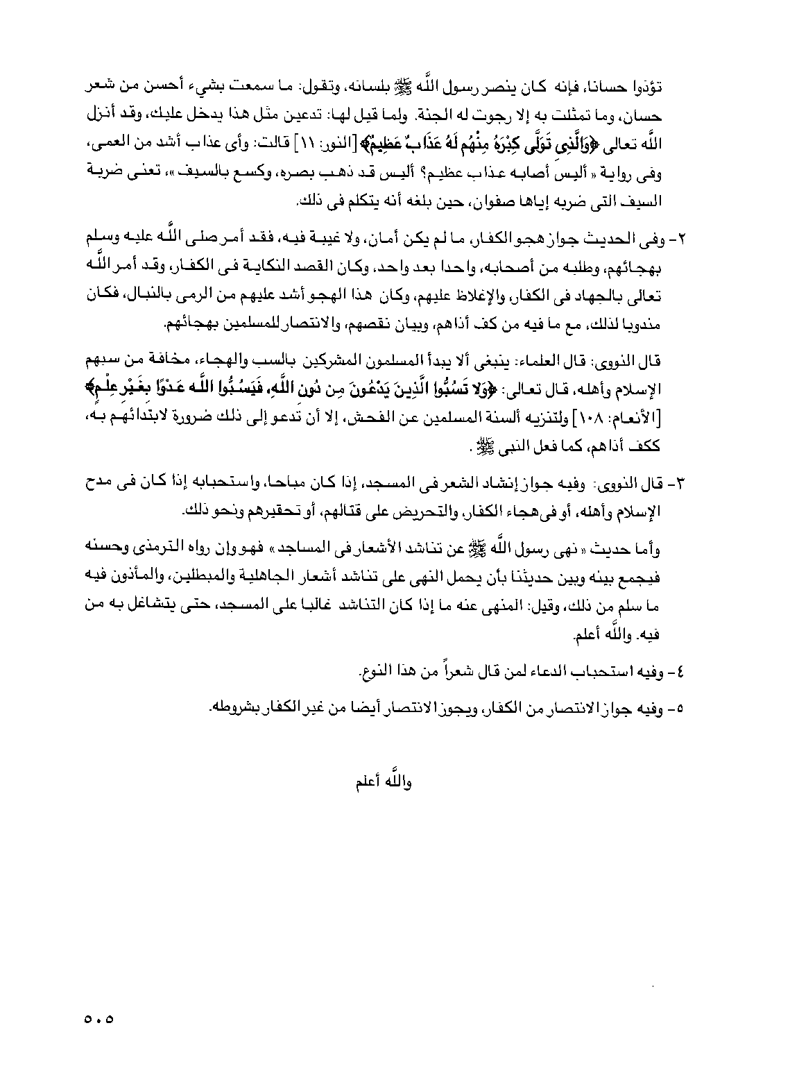 3 - قال النووي: وفيه جواز إنشاد الشعر في المسجد، إذا كان مباحا، واستحبابه إذا كان في مدح الإسلام وأهله، أو في هجاء الكفار، والتحريض على قتالهم، أو تحقيرهم ونحو ذلك.