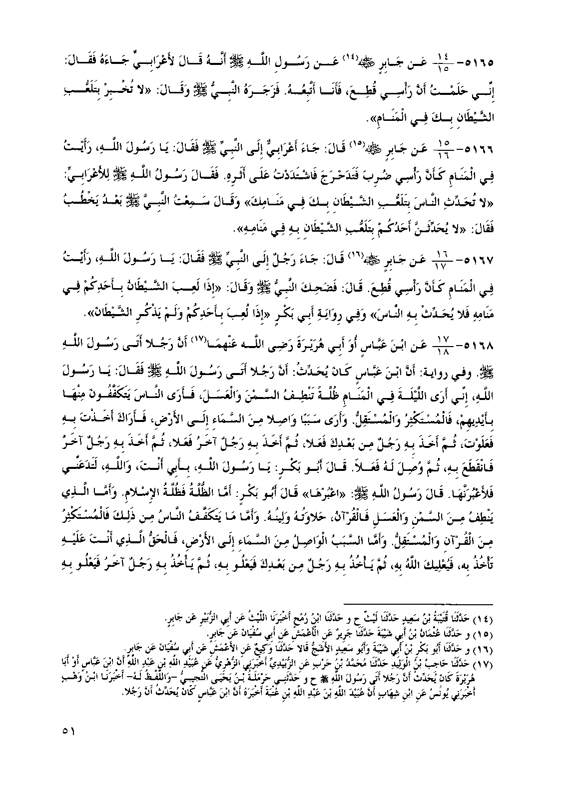 5165 - عن جابر رضي الله عنه عن رسول الله صلى الله عليه وسلم أنه قال لأعرابي جاءه فقال: إني حلمت أن رأسي قطع، فأنا أتبعه. فزجره النبي صلى الله عليه وسلم وقال: "لا تخبر بتلعب الشيطان بك في المنام".