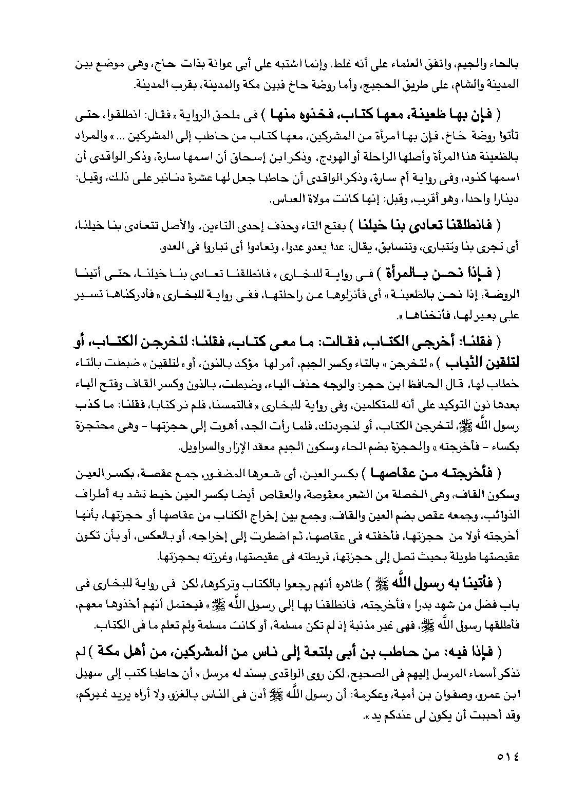 (فإن بها ظعينة، معها كتاب، فخذوه منها) في ملحق الرواية "فقال: انطلقوا، حتى تأتوا روضة خاخ، فإن بها امرأة من المشركين، معها كتاب من حاطب إلى المشركين .... " والمراد بالظعينة هنا المرأة وأصلها الراحلة أو الهودج، وذكر ابن إسحاق أن اسمها سارة، وذكر الواقدي أن اسمها كنود، وفي رواية أم سارة، وذكر الواقدي أن حاطبا جعل لها عشرة دنانير على ذلك، وقيل: دينارا واحدا، وهو أقرب، وقيل: إنها كانت مولاة العباس.
