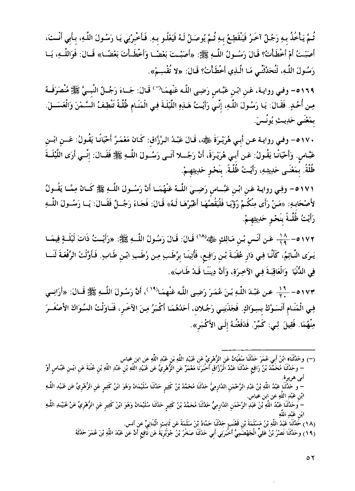 5171 - وفي رواية عن ابن عباس رضي الله عنهما أن رسول الله صلى الله عليه وسلم كان مما يقول لأصحابه: "من رأى منكم رؤيا فليقصها أعبرها له" قال: فجاء رجل فقال: يا رسول الله رأيت ظلة بنحو حديثهم.