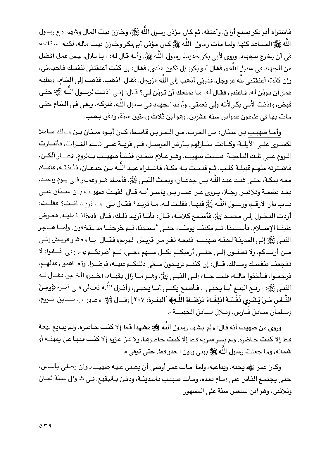 وأما صهيب بن سنان: من العرب، من النمر بن قاسط، كان أبوه سنان بن مالك عاملا لكسرى على الأيلة، وكانت منازلهم بأرض الموصل، في قرية على شط الفرات، فأغارت الروم على تلك الناحية، فسبت صهيبا، وهو غلام صغير، فنشأ صهيب بالروم، فصار ألكن، فاشترته منهم قبيلة كلب، ثم قدمت به مكة، فاشتراه عبد الله بن جدعان، فأعتقه، فأقام معه بمكة، حتى هلك عبد الله بن جدعان، وبعث النبي صلى الله عليه وسلم، فأسلم هو وعمار في يوم واحد، بعد بضعة وثلاثين رجلا، يروى عن عمار بن ياسر أنه قال: لقيت صهيب بن سنان على باب دار الأرقم، ورسول الله صلى الله عليه وسلم فيها، فقلت له، ما تريد؟ فقال لي: ما تريد أنت؟ فقلت: أردت الدخول إلى محمد صلى الله عليه وسلم، فأسمع كلامه، قال: فأنا أريد ذلك، قال: فدخلنا عليه، فعرض علينا الإسلام، فأسلمنا، ثم مكثنا يومنا، حتى أمسينا، ثم خرجنا مستخفين، ولما هاجر النبي صلى الله عليه وسلم إلى المدينة لحقه صهيب، فتبعه نفر من قريش: ليردوه فقال: يا معشر قريش إني من أرماكم، ولا تصلون إلي حتى أرميكم بكل سهم معي، ثم أضربكم بسيفي، قالوا: لا تفجعنا بنفسك ومالك. قال: إن كنتم تريدون مالي دللتكم عليه، فرضوا، وتعاهدوا، فدلهم، فرجعوا، فأخذوا ماله، فلما جاء إلى النبي صلى الله عليه وسلم، وهو ما زال بقباء، أخبره الخبر، فقال له النبي صلى الله عليه وسلم: "ربح البيع أبا يحيى". فأصبح يكنى أبا يحيى، وأنزل الله تعالى في أمره {ومن الناس من يشري نفسه ابتغاء مرضاة الله} [البقرة: 207] وقال صلى الله عليه وسلم: "صهيب سابق الروم، وسلمان سابق فارس، وبلال سابق الحبشة".