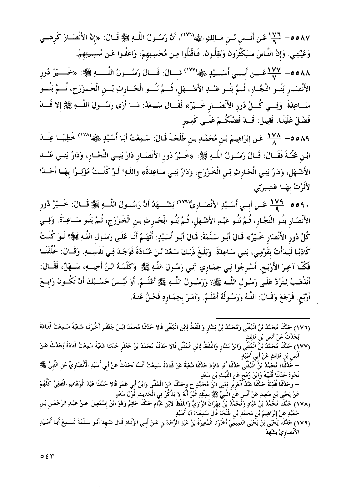 5589 - عن إبراهيم بن محمد بن طلحة قال: سمعت أبا أسيد رضي الله عنه خطيبا عند ابن عتبة فقال: قال رسول الله صلى الله عليه وسلم: "خير دور الأنصار دار بني النجار، ودار بني عبد الأشهل، ودار بني الحارث بن الخزرج، ودار بني ساعدة" والله! لو كنت مؤثرا بها أحدا لأثرت بها عشيرتي.