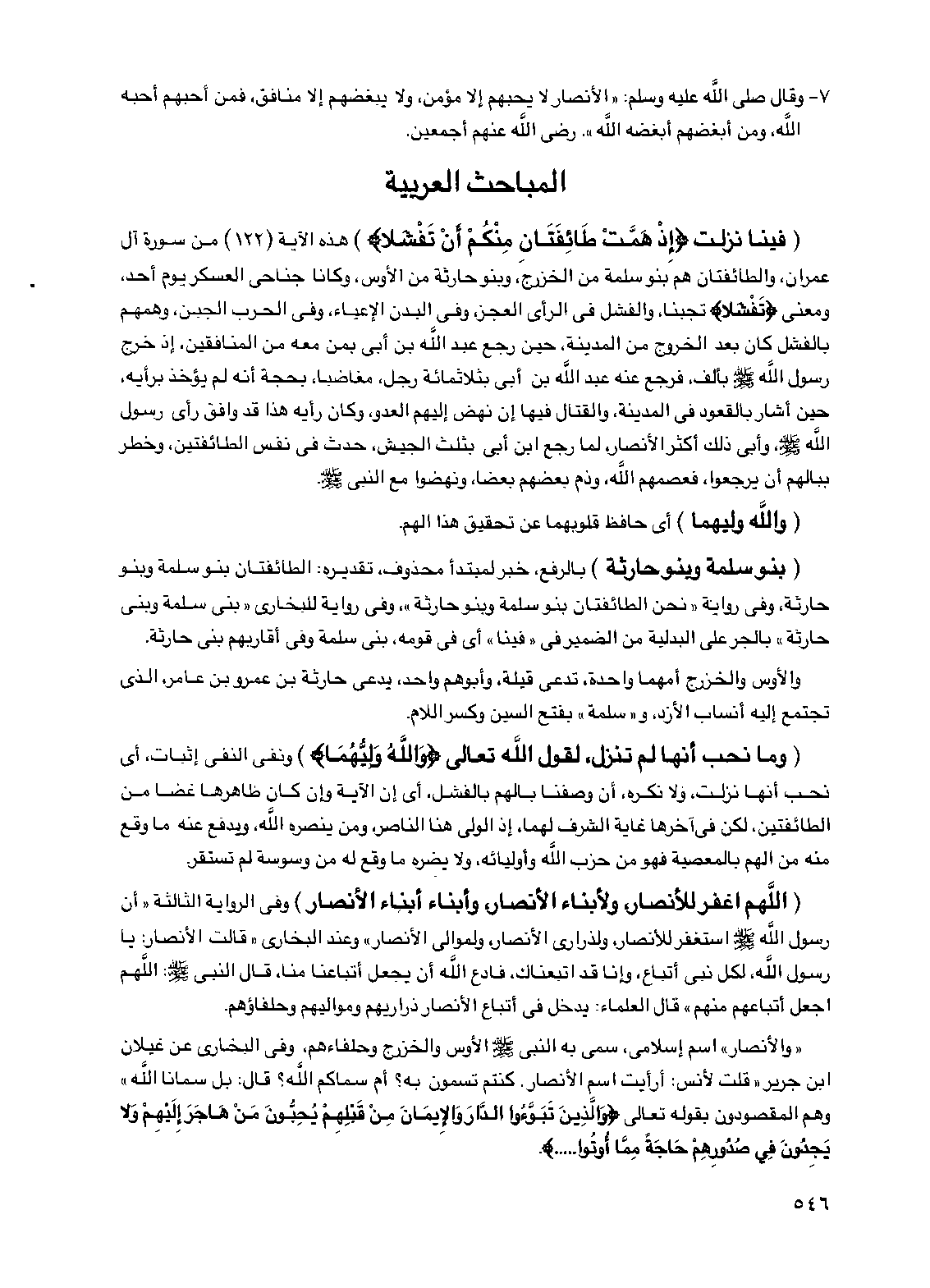 (فينا نزلت {إذ همت طائفتان منكم أن تفشلا}) هذه الآية (122) من سورة آل عمران، والطائفتان هم بنو سلمة من الخزرج، وبنو حارثة من الأوس، وكانا جناحي العسكر يوم أحد، ومعنى {تفشلا} تجبنا، والفشل في الرأي العجز، وفي البدن الإعياء، وفي الحرب الجبن، وهمهم بالفشل كان بعد الخروج من المدينة، حين رجع عبد الله بن أبي بمن معه من المنافقين، إذ خرج رسول الله صلى الله عليه وسلم بألف، فرجع عنه عبد الله بن أبي بثلاثمائة رجل، مغاضبا، بحجة أنه لم يؤخذ برأيه، حين أشار بالقعود في المدينة، والقتال فيها إن نهض إليهم العدو، وكان رأيه هذا قد وافق رأي رسول الله صلى الله عليه وسلم، وأبى ذلك أكثر الأنصار، لما رجع ابن أبي بثلث الجيش، حدث في نفس الطائفتين، وخطر ببالهم أن يرجعوا، فعصمهم الله، وذم بعضهم بعضا، ونهضوا مع النبي صلى الله عليه وسلم.