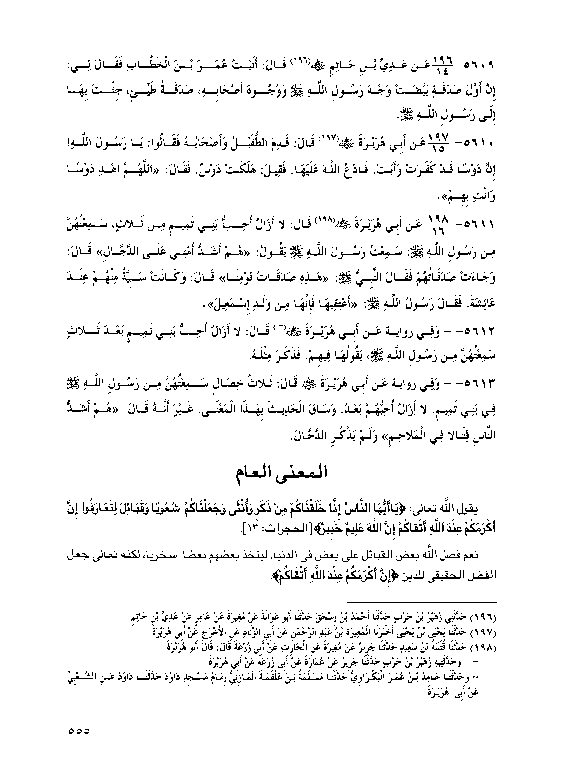 5609 - عن عدي بن حاتم رضي الله عنه قال: أتيت عمر بن الخطاب فقال لي: إن أول صدقة بيضت وجه رسول الله صلى الله عليه وسلم ووجوه أصحابه، صدقة طيئ، جئت بها إلى رسول الله صلى الله عليه وسلم.