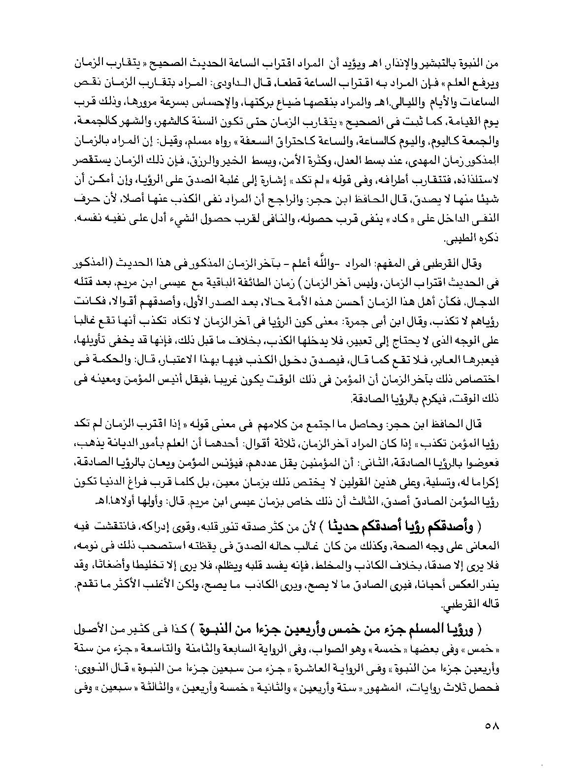 وقال القرطبي في المفهم: المراد - والله أعلم - بآخر الزمان المذكور في هذا الحديث (المذكور في الحديث اقتراب الزمان، وليس آخر الزمان) زمان الطائفة الباقية مع عيسى ابن مريم، بعد قتله الدجال، فكأن أهل هذا الزمان أحسن هذه الأمة حالا، بعد الصدر الأول، وأصدقهم أقوالا، فكانت رؤياهم لا تكذب، وقال ابن أبي جمرة: معنى كون الرؤيا في آخر الزمان لا تكاد تكذب أنها تقع غالبا على الوجه الذي لا يحتاج إلى تعبير، فلا يدخلها الكذب، بخلاف ما قبل ذلك، فإنها قد يخفى تأويلها، فيعبرها العابر، فلا تقع كما قال، فيصدق دخول الكذب فيها بهذا الاعتبار، قال: والحكمة في اختصاص ذلك بآخر الزمان أن المؤمن في ذلك الوقت يكون غريبا، فيقل أنيس المؤمن ومعينه في ذلك الوقت، فيكرم بالرؤيا الصادقة.