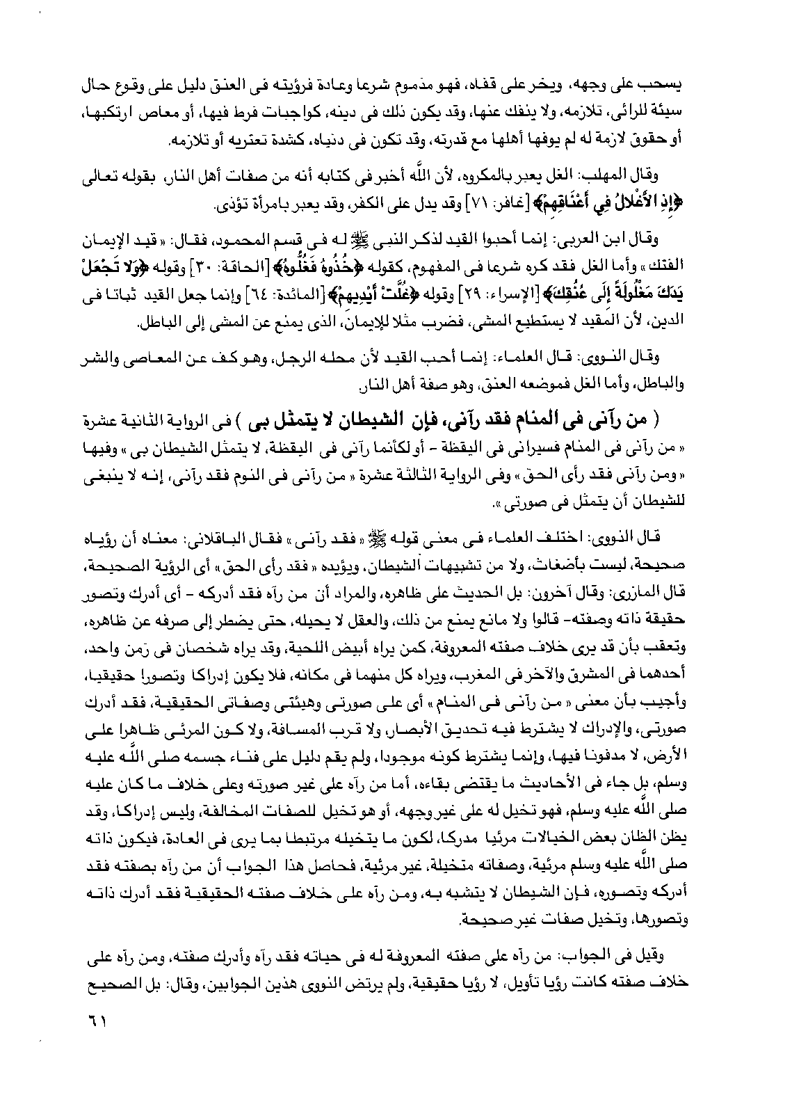 يسحب على وجهه، ويخر على قفاه، فهو مذموم شرعا وعادة فرؤيته في العنق دليل على وقوع حال سيئة للرائي تلازمه ولا ينفك عنها، وقد يكون ذلك في دينه كواجبات فرط فيها، أو معاص ارتكبها، أو حقوق لازمة له لم يوفها أهلها مع قدرته، وقد تكون في دنياه، كشدة تعتريه أو تلازمه.