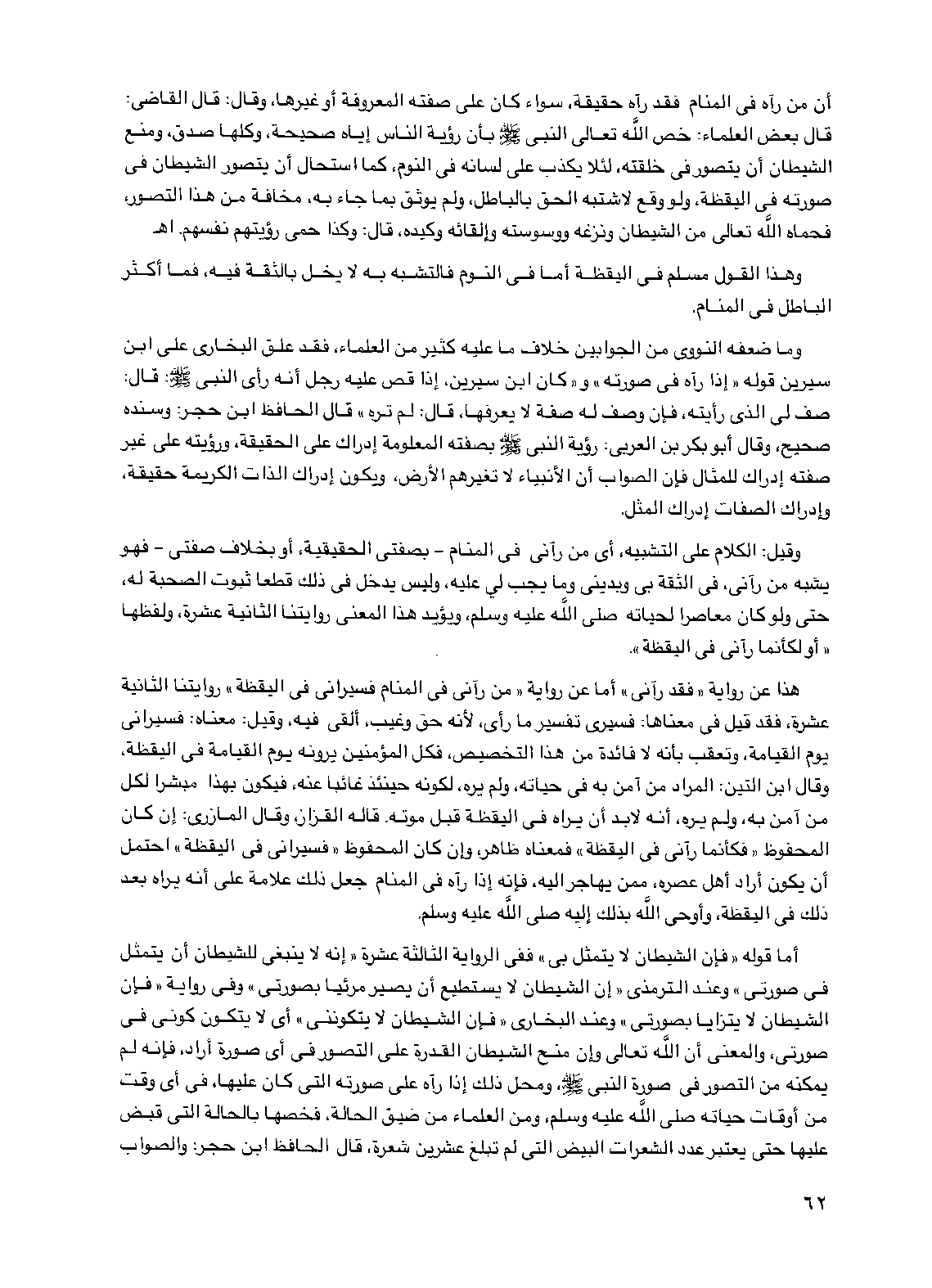 أن من رآه في المنام فقد رآه حقيقة، سواء كان على صفته المعروفة أو غيرها، وقال: قال القاضي: قال بعض العلماء: خص الله تعالى النبي صلى الله عليه وسلم بأن رؤية الناس إياه صحيحة، وكلها صدق ومنع الشيطان أن يتصور في خلقته لئلا يكذب على لسانه في النوم، كما استحال أن يتصور الشيطان في صورته في اليقظة، ولو وقع لاشتبه الحق بالباطل، ولم يوثق بما جاء به، مخافة من هذا التصور، فحماه الله تعالى من الشيطان ونزغه ووسوسته وإلقائه وكيده، قال: وكذا حمى رؤيتهم أنفسهم. اهـ.