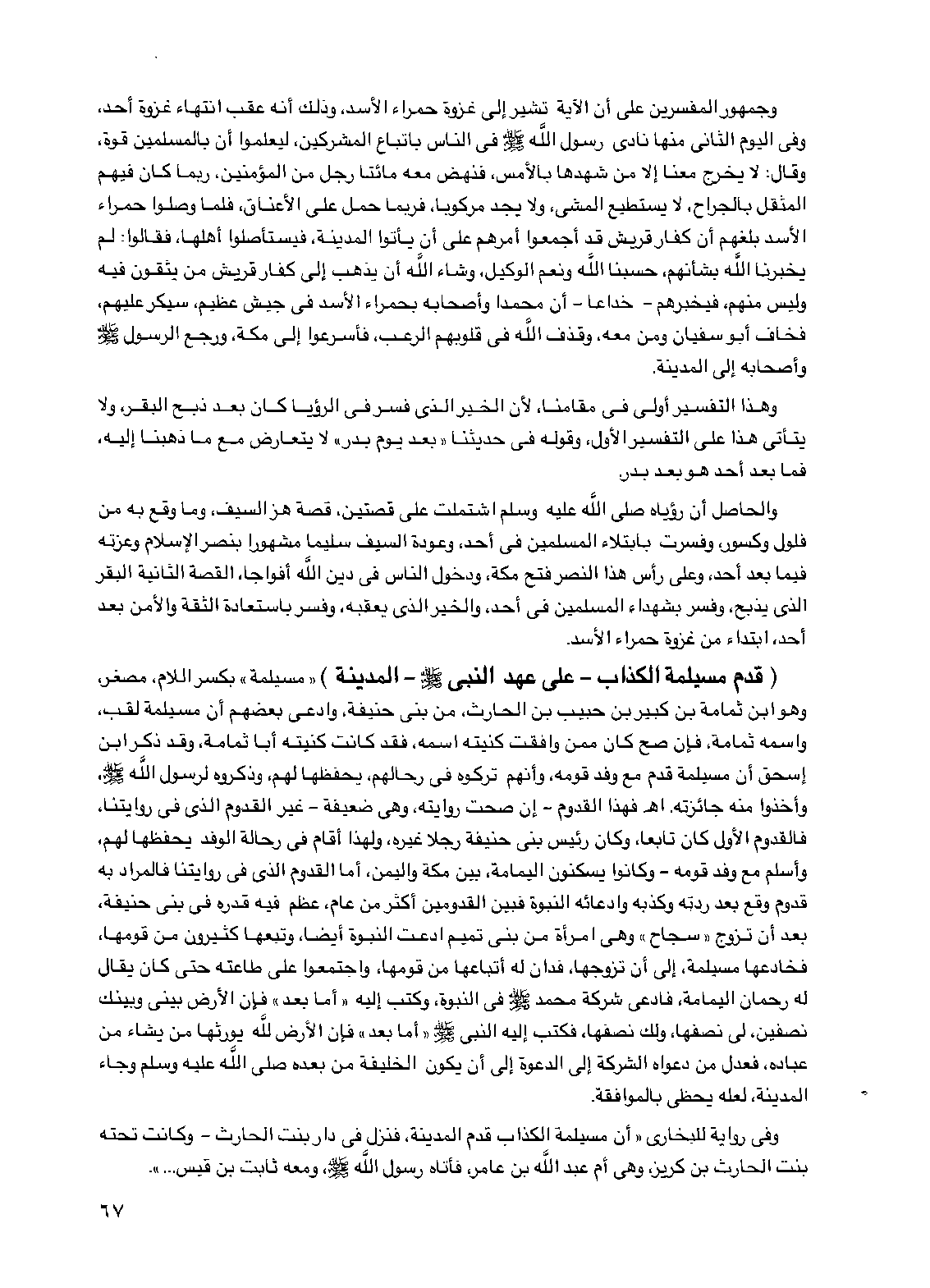 (قدم مسيلمة الكذاب - على عهد النبي صلى الله عليه وسلم - المدينة) "مسيلمة" بكسر اللام، مصغر، وهو ابن ثمامة بن كبير بن حبيب بن الحارث، من بني حنيفة، وادعى بعضهم أن مسيلمة لقب، واسمه ثمامة، فإن صح كان ممن وافقت كنيته اسمه، فقد كانت كنيته أبا ثمامة، وقد ذكر ابن إسحاق أن مسيلمة قدم مع وفد قومه، وأنهم تركوه في رحالهم يحفظها لهم، وذكروه لرسول الله صلى الله عليه وسلم، وأخذوا منه جائزته. اهـ. فهذا القدوم - إن صحت روايته، وهي ضعيفة - غير القدوم الذي في روايتنا، فالقدوم الأول كان تابعا، وكان رئيس بني حنيفة رجلا غيره، ولهذا أقام في رحالة الوفد يحفظها لهم، وأسلم مع وفد قومه - وكانوا يسكنون اليمامة، بين مكة واليمن، أما القدوم الذي في روايتنا فالمراد به قدوم وقع بعد ردته وكذبه وادعائه النبوة فبين القدومين أكثر من عام، عظم فيه قدره في بني حنيفة، بعد أن تزوج "سجاح" وهي امرأة من بني تميم ادعت النبوة أيضا وتبعها كثيرون من قومها، فخادعها مسيلمة إلى أن تزوجها، فدان له أتباعها من قومها واجتمعوا على طاعته حتى كان يقال له رحمان اليمامة، فادعى شركة محمد صلى الله عليه وسلم في النبوة، وكتب إليه "أما بعد" فإن الأرض بيني وبينك نصفين، لي نصفها، ولك نصفها، فكتب إليه النبي صلى الله عليه وسلم "أما بعد" فإن الأرض لله يورثها من يشاء من عباده، فعدل من دعواه الشركة إلى الدعوة إلى أن يكون الخليفة من بعده صلى الله عليه وسلم وجاء المدينة، لعله يحظى بالموافقة.