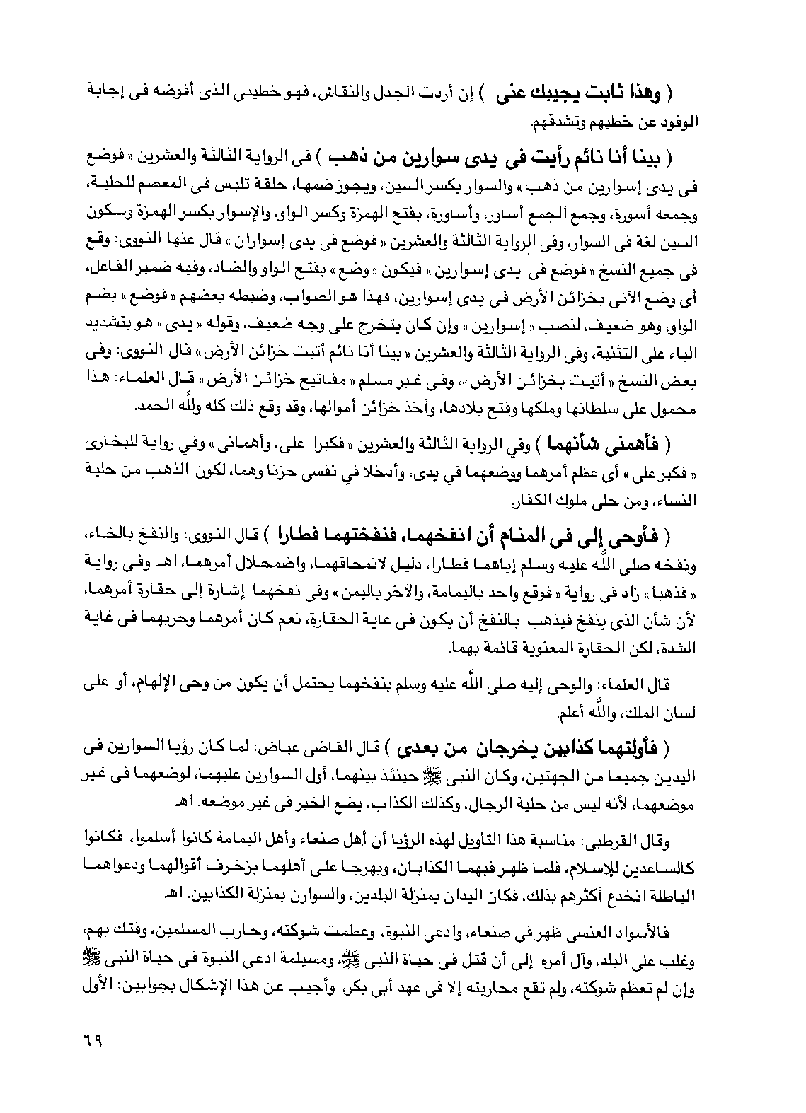 (بينا أنا نائم رأيت في يدي سوارين من ذهب) في الرواية الثالثة والعشرين "فوضع في يدي إسوارين من ذهب" والسوار بكسر السين، ويجوز ضمها، حلقة تلبس في المعصم للحلية، وجمعه أسورة، وجمع الجمع أساور، وأساورة، بفتح الهمزة وكسر الواو، والإسوار بكسر الهمزة وسكون السين لغة في السوار، وفي الرواية الثالثة والعشرين "فوضع في يدي إسواران" قال عنها النووي: وقع في جميع النسخ "فوضع في يدي إسوارين" فيكون "وضع" بفتح الواو والضاد، وفيه ضمير الفاعل، أي وضع الآتي بخزائن الأرض في يدي إسوارين، فهذا هو الصواب، وضبطه بعضهم "فوضع" بضم الواو، وهو ضعيف، لنصب "إسوارين" وإن كان يتخرج على وجه ضعيف، وقوله "يدي" هو بتشديد الياء على التثنية، وفي الرواية الثالثة والعشرين "بينا أنا نائم أتيت خزائن الأرض" قال النووي: وفي بعض النسخ "أتيت بخزائن الأرض" وفي غير مسلم "مفاتيح خزائن الأرض" قال العلماء: هذا محمول على سلطانها وملكها وفتح بلادها، وأخذ خزائن أموالها، وقد وقع ذلك كله ولله الحمد.