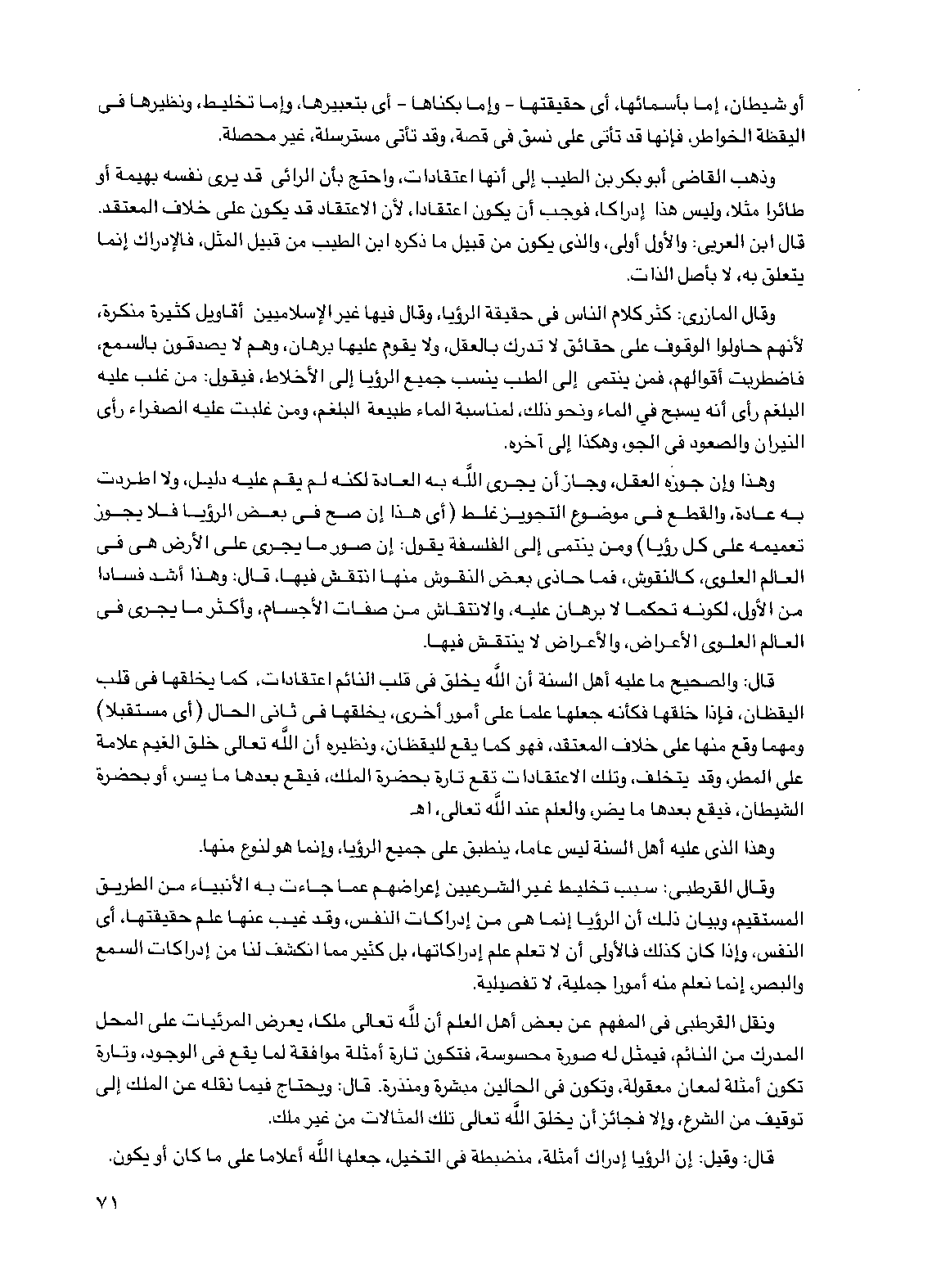 قال: والصحيح ما عليه أهل السنة أن الله يخلق في قلب النائم اعتقادات، كما يخلقها في قلب اليقظان، فإذا خلقها فكأنه جعلها علما على أمور أخرى، يخلقها في ثاني الحال (أي مستقبلا) ومهما وقع منها على خلاف المعتقد، فهو كما يقع لليقظان، ونظيره أن الله تعالى خلق الغيم علامة على المطر وقد يتخلف، وتلك الاعتقادات تقع تارة بحضرة الملك، فيقع بعدها ما يسر، أو بحضرة الشيطان، فيقع بعدها ما يضر، والعلم عند الله تعالى، اهـ.