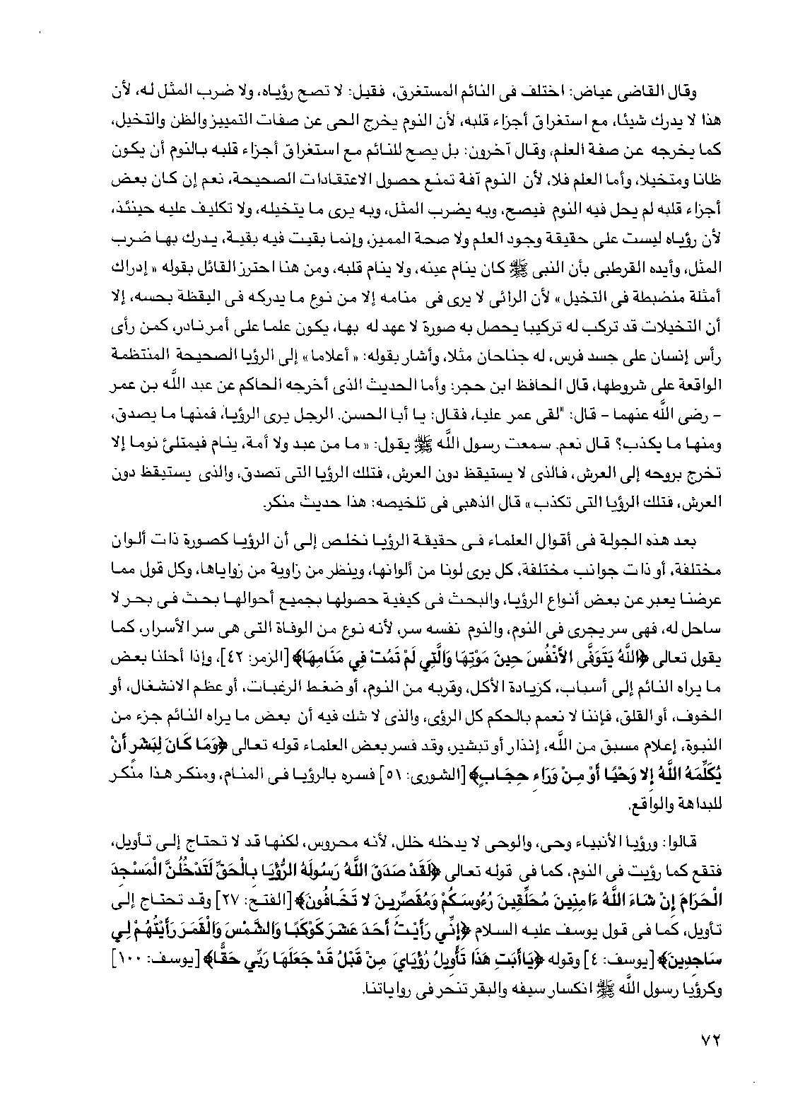 وقال القاضي عياض: اختلف في النائم المستغرق، فقيل: لا تصح رؤياه ولا ضرب المثل له، لأن هذا لا يدرك شيئا، مع استغراق أجزاء قلبه، لأن النوم يخرج الحي عن صفات التمييز والظن والتخيل، كما يخرجه عن صفة العلم، وقال آخرون: بل يصح للنائم مع استغراق أجزاء قلبه بالنوم أن يكون ظانا ومتخيلا وأما العلم فلا لأن النوم آفة تمنع حصول الاعتقادات الصحيحة نعم إن كان بعض أجزاء قلبه لم يحل فيه النوم فيصح، وبه يضرب المثل وبه يرى ما يتخيله ولا تكليف عليه حينئذ لأن رؤياه ليست على حقيقة وجود العلم ولا صحة المميز وإنما بقيت فيه بقية، يدرك بها ضرب المثل وأيده القرطبي بأن النبي صلى الله عليه وسلم كان ينام عينه، ولا ينام قلبه ومن هنا احترز القائل بقوله "إدراك أمثلة منضبطة في التخيل" لأن الرائي لا يرى في منامه إلا من نوع ما يدركه في اليقظة بحسه، إلا أن التخيلات قد تركب له تركيبا يحصل به صورة لا عهد له بها، يكون علما على أمر نادر، كمن رأى رأس إنسان على جسد فرس، له جناحان مثلا، وأشار بقوله: "أعلاما" إلى الرؤيا الصحيحة المنتظمة الواقعة على شروطها قال الحافظ ابن حجر: وأما الحديث الذي أخرجه الحاكم عن عبد الله بن عمر - رضي الله عنهما - قال: "لقي عمر عليا، فقال: يا أبا الحسن. الرجل يرى الرؤيا فمنها ما يصدق، ومنها ما يكذب؟ قال نعم. سمعت رسول الله صلى الله عليه وسلم يقول: "ما من عبد ولا أمة، ينام فيمتلئ نوما إلا تخرج بروحه إلى العرش فالذي لا يستيقظ دون العرش فتلك الرؤيا التي تصدق والذي يستيقظ دون العرش، فتلك الرؤيا التي تكذب" قال الذهبي في تلخيصه: هذا حديث منكر.