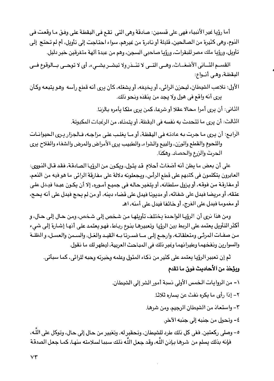 الرابع: أن يرى ما جرت به عادته في اليقظة، أو ما يغلب على مزاجه فالجزار يرى الحيوانات واللحوم والقطع والوزن والبيع والشراء والطبيب يرى الأمراض والمرض والشفاء والفلاح يرى الحرث والزرع والحصاد. وهكذا.