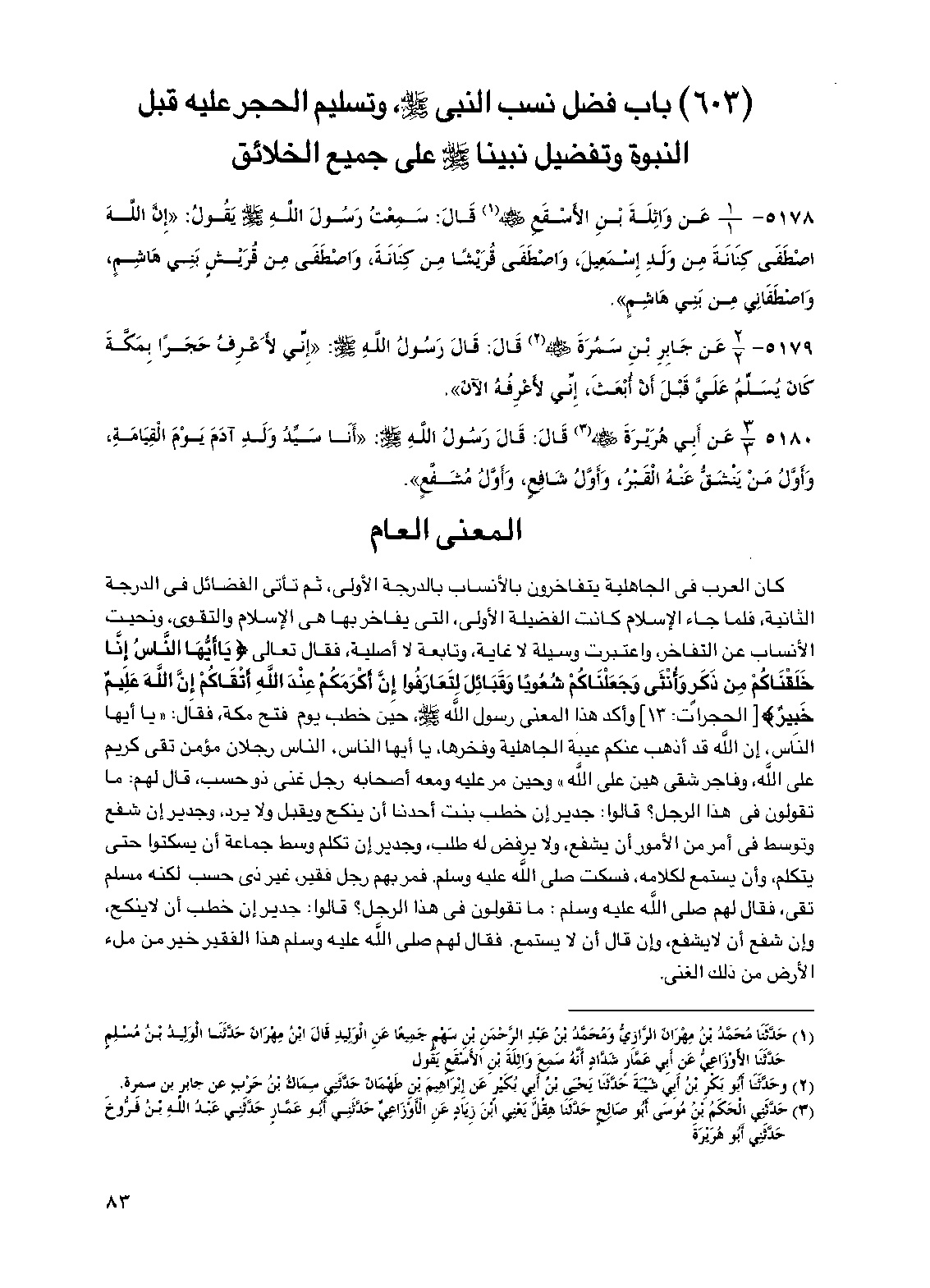 (603) باب فضل نسب النبي صلى الله عليه وسلم وتسليم الحجر عليه قبل النبوة وتفضيل نبينا صلى الله عليه وسلم على جميع الخلائق