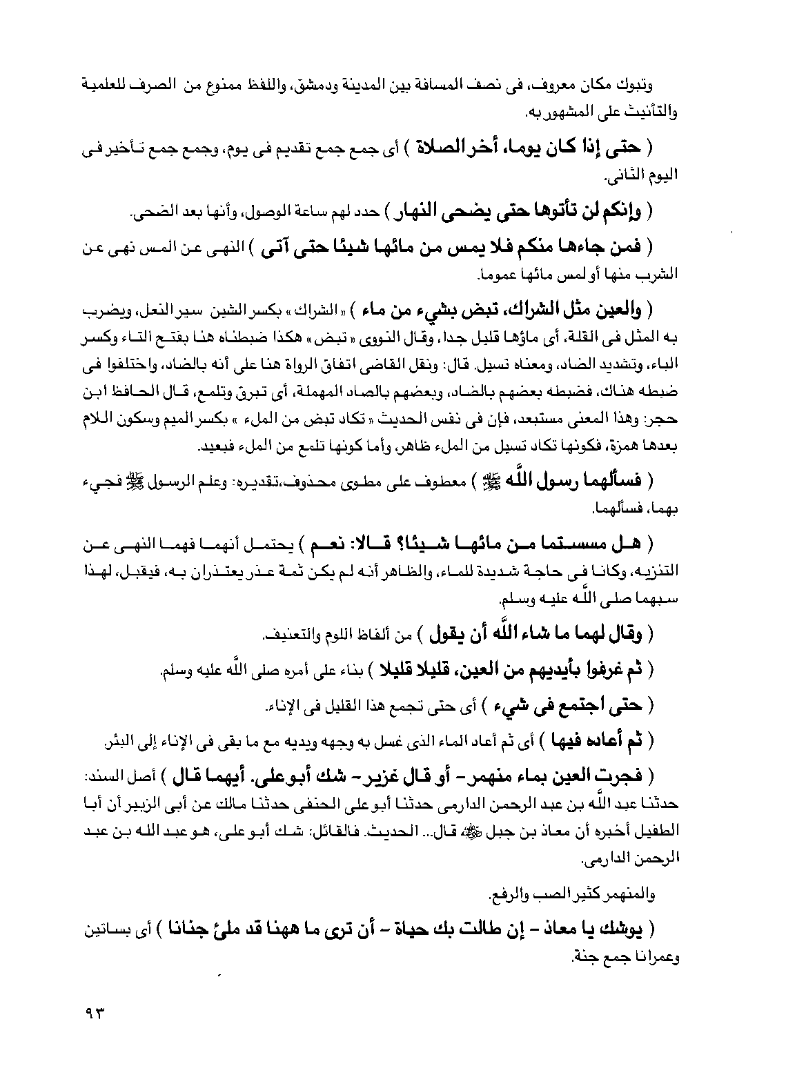 (والعين مثل الشراك، تبض بشيء من ماء) "الشراك" بكسر الشين سير النعل، ويضرب به المثل في القلة، أي ماؤها قليل جدا، وقال النووي "تبض" هكذا ضبطناه هنا بفتح التاء وكسر الباء، وتشديد الضاد ومعناه تسيل. قال: ونقل القاضي اتفاق الرواة هنا على أنه بالضاد واختلفوا في ضبطه هناك، فضبطه بعضهم بالضاد، وبعضهم بالصاد المهملة، أي تبرق وتلمع، قال الحافظ ابن حجر: وهذا المعنى مستبعد، فإن في نفس الحديث "تكاد تبض من الملء" بكسر الميم وسكون اللام بعدها همزة، فكونها تكاد تسيل من الملء ظاهر، وأما كونها تلمع من الملء فبعيد.