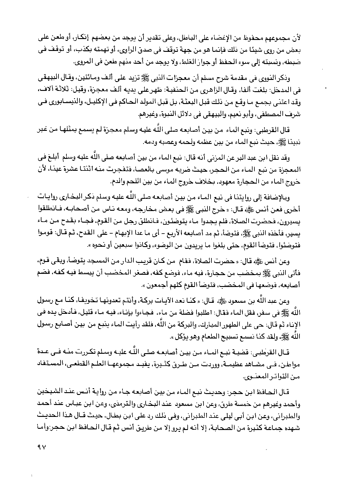 قال القرطبي: قضية نبع الماء من بين أصابعه صلى الله عليه وسلم تكررت منه في عدة مواطن، في مشاهد عظيمة، ووردت من طرق كثيرة يفيد مجموعها العلم القطعي، المستفاد من التواتر المعنوي.