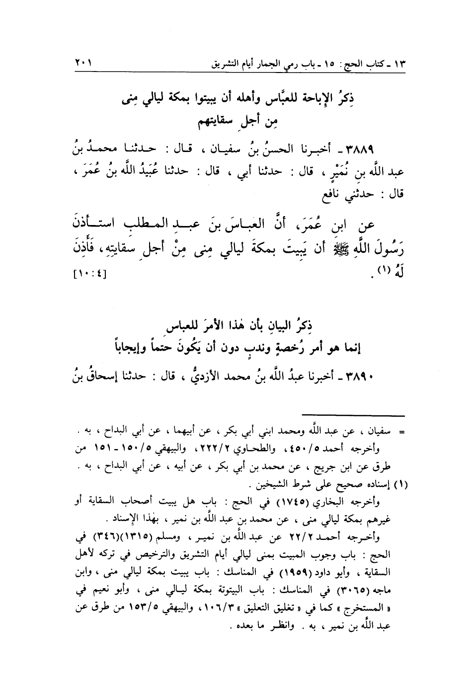 3889 - أَخْبَرَنَا الْحَسَنُ بْنُ سُفْيَانَ، قَالَ: حَدَّثَنَا مُحَمَّدُ بْنُ عَبْدِ اللَّهِ بْنِ نُمَيْرٍ، قَالَ: حَدَّثَنَا أَبِي، قَالَ: حَدَّثَنَا عُبَيْدُ اللَّهِ بْنُ عُمَرَ، قَالَ: حَدَّثَنِي نافع عن بن عُمَرَ أَنَّ الْعَبَّاسَ بْنَ عَبْدِ الْمُطَّلِبِ اسْتَأْذَنَ رَسُولَ اللَّهِ صَلَّى اللَّهُ عَلَيْهِ وَسَلَّمَ أن يبيت بمكة ليالي من أجل سقايته، فأذن له1. [10:4]