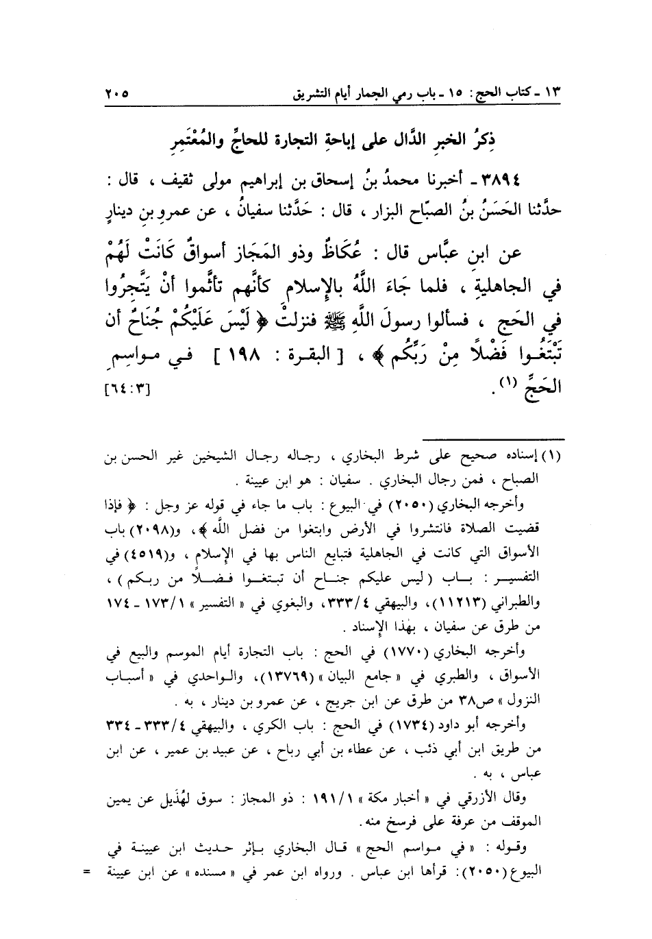 3894 - أَخْبَرَنَا مُحَمَّدُ بْنُ إِسْحَاقَ بْنِ إِبْرَاهِيمَ مَوْلَى ثَقِيفٍ، قَالَ: حَدَّثَنَا الْحَسَنُ بْنُ الصَّبَّاحِ الْبَزَّارُ، قَالَ: حَدَّثَنَا سُفْيَانُ، عَنْ عَمْرِو بْنِ دِينَارٍ عَنْ بن عَبَّاسٍ قَالَ: عُكَاظُ وَذُو الْمَجَازِ أَسْوَاقٌ كَانَتْ لَهُمْ فِي الْجَاهِلِيَّةِ، فَلَمَّا جَاءَ اللَّهُ بِالْإِسْلَامِ كَأَنَّهُمْ تَأَثَّمُوا أَنْ يَتَّجِرُوا فِي الْحَجِّ، فَسَأَلُوا رَسُولَ اللَّهِ صَلَّى اللَّهُ عَلَيْهِ وَسَلَّمَ فَنَزَلَتْ: {لَيْسَ عَلَيْكُمْ جُنَاحٌ أَنْ تَبْتَغُوا فَضْلًا مِنْ رَبِّكُمْ} [البقرة: 198] في مواسم الحج 1. [64:3]