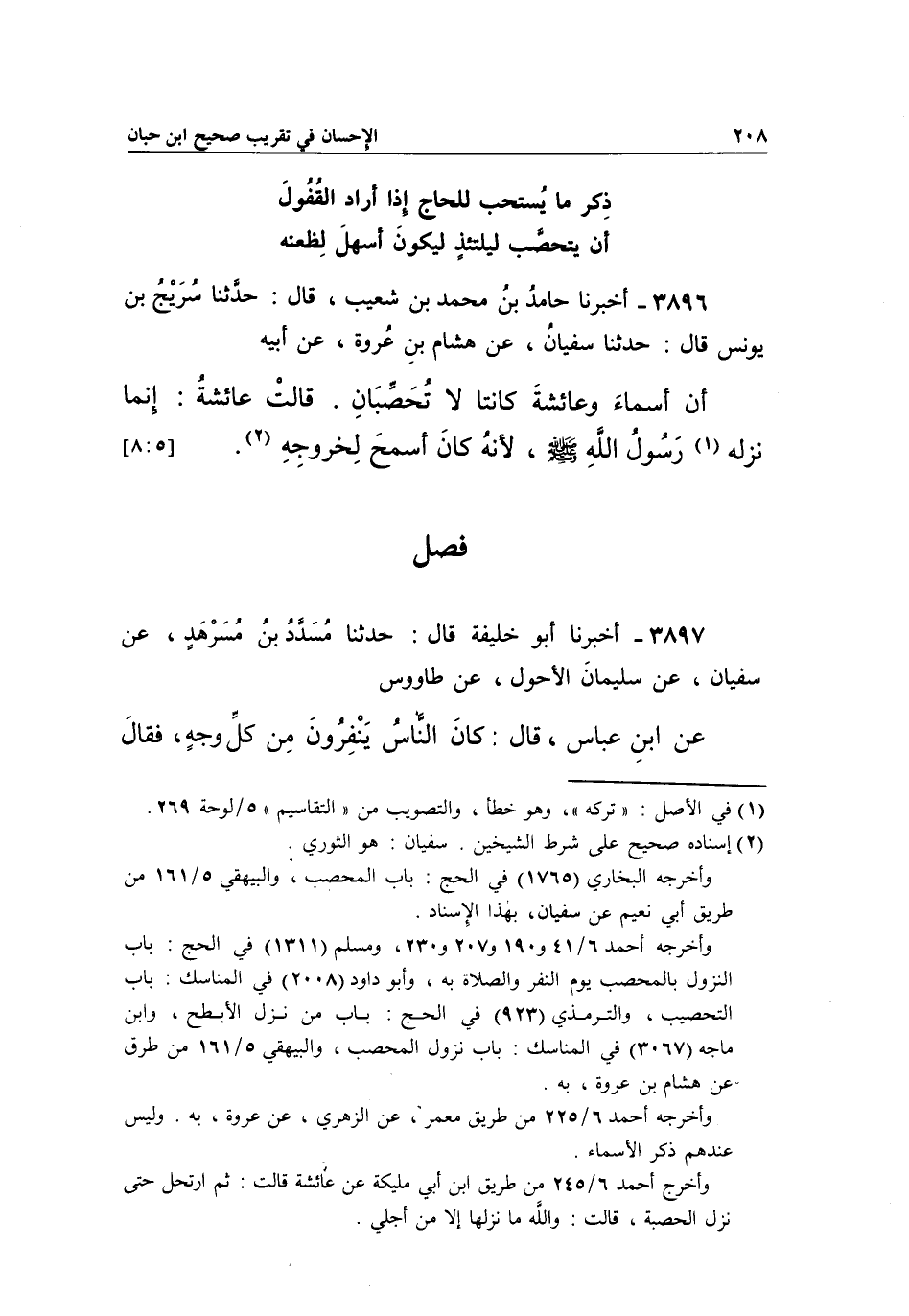 3896 - أَخْبَرَنَا حَامِدُ بْنُ مُحَمَّدِ بْنِ شُعَيْبٍ، قَالَ: حَدَّثَنَا سُرَيْجُ بْنُ يُونُسَ، قَالَ: حَدَّثَنَا سُفْيَانَ، عَنْ هِشَامِ بْنِ عُرْوَةَ، عَنْ أَبِيهِ أَنَّ أَسْمَاءَ وَعَائِشَةَ كَانَتَا لَا تُحَصِّبَانِ. قَالَتْ: عَائِشَةُ: إِنَّمَا نَزَلَهُ1 رَسُولُ اللَّهِ صَلَّى اللَّهُ عَلَيْهِ وَسَلَّمَ؛ لأنه كان أسمح لخروجه2. [8:5]