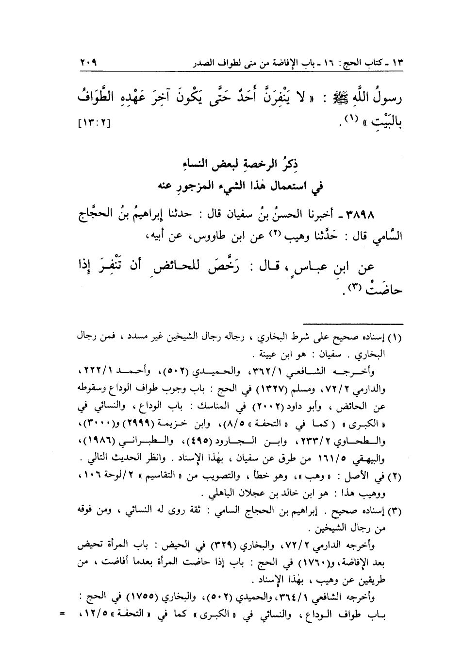 3898 - أَخْبَرَنَا الْحَسَنُ بْنُ سُفْيَانَ، قَالَ: حَدَّثَنَا إِبْرَاهِيمُ بْنُ الْحَجَّاجِ السَّامِيُّ قَالَ: حَدَّثَنَا وُهَيْبٌ1، عَنْ بن طاوس، عن أبيه، عن بن عَبَّاسٍ قَالَ: رَخَّصَ لِلْحَائِضِ أَنْ تَنْفِرَ إِذَا حاضت 2.